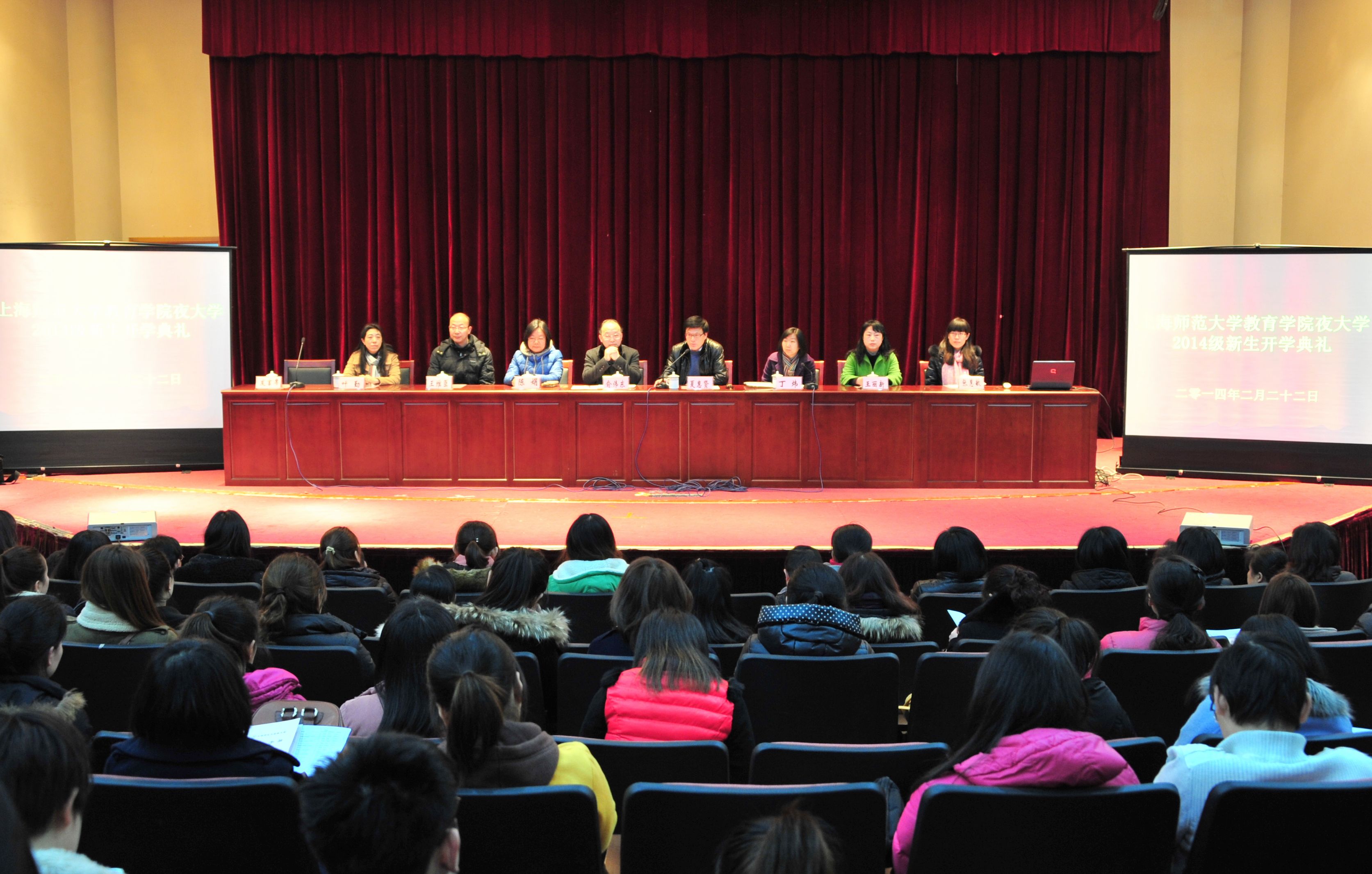2014年2月22日下午教育学院夜大学2014级新生开学典礼暨入学教育在教苑楼C座多功能厅隆重举行。继续教育学院院长俞伟东、夜大学办公室主任陈娟、教育学院院长夏惠贤、学院夜大学分管副院长丁炜、夜大学各专业负责人、夜大学办公室工作人员以及教育学院夜大学全体2014级新生280余人参加了此次新生开学典礼。典礼由丁炜副院长主持。