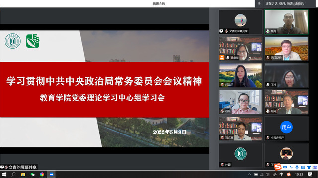 5月9日上午,教育学院党委以中心组会议的形式,认真组织学习了习近平总书记5月5日在中共中央政治局常委委员会会议上的重要讲话精神,同时就学院疫情防控工作进行专题部署。学院党委中心组全体成员在线参加会议。会议由院党委书记徐晓明主持。