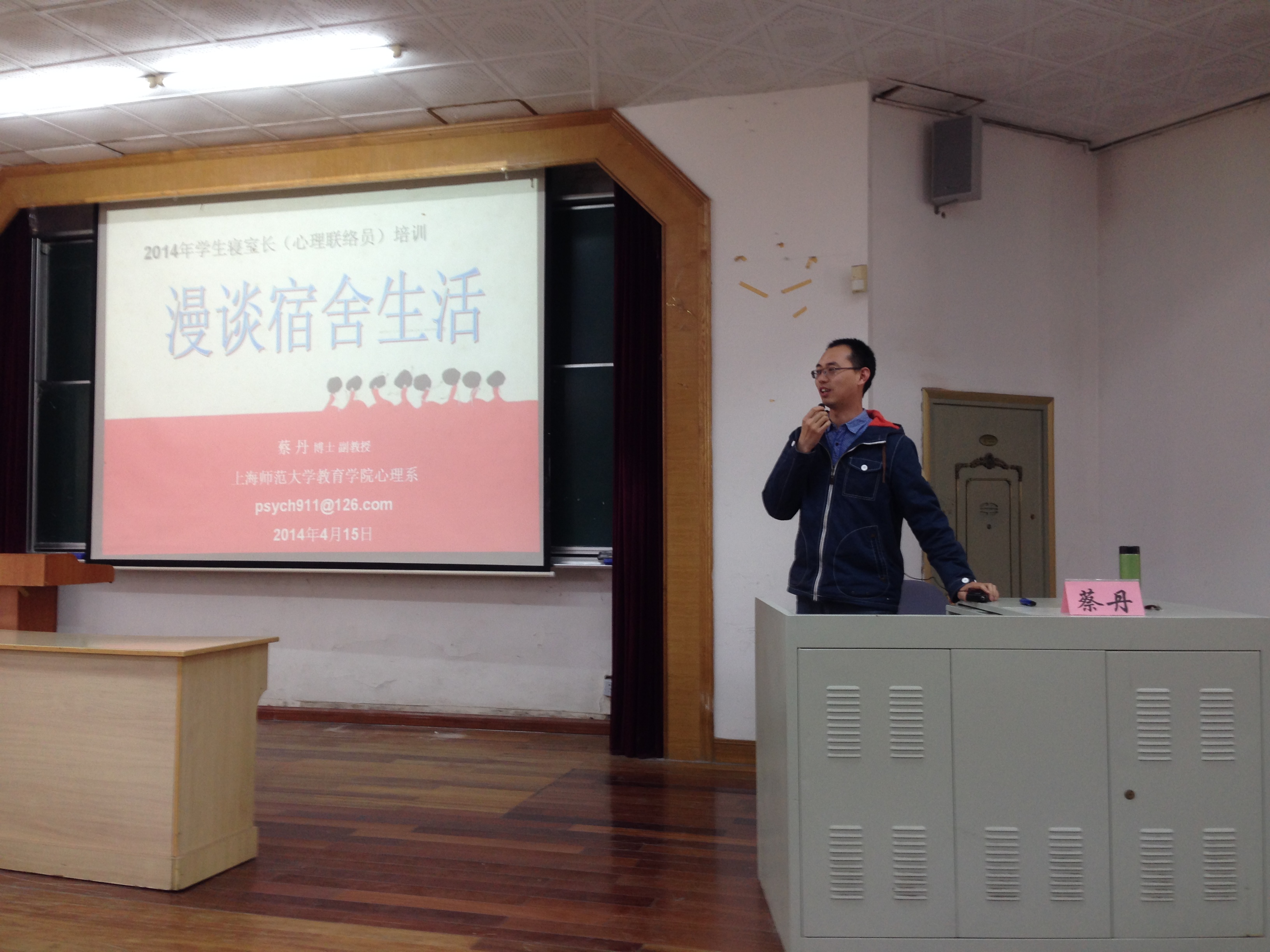 为进一步提升寝室长队伍的综合素质,增强同学之间自我管理、自我教育、自我服务意识,2014年4月15日12时,学院在奉贤校区二教102教室举办了本科一、二年级全体寝室长培训讲座,讲座由我院心理系副教授蔡丹老师主讲。