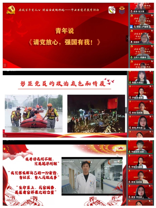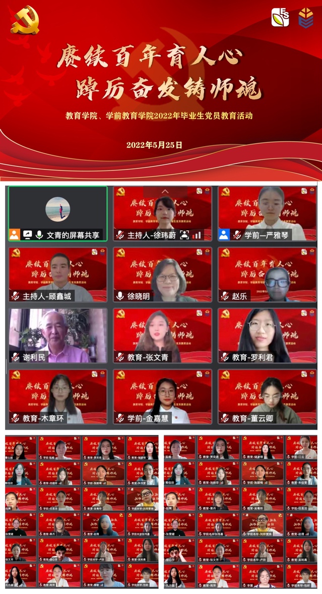 5月25日下午,教育学院、学前教育学院于云端顺利召开“赓续百年育人心 踔厉奋发铸师魂”毕业生党员集中教育。伟德国际BETVlCTOR、学前教育学院党委书记徐晓明,党委副书记、副院长赵乐,伟德国际BETVlCTOR特邀党建组织员谢利民,党委组织员,毕业班辅导员以及2022届全体毕业生党员出席了本次活动。活动由毕业生党员顾鑫城与徐玮蔚同学主持。