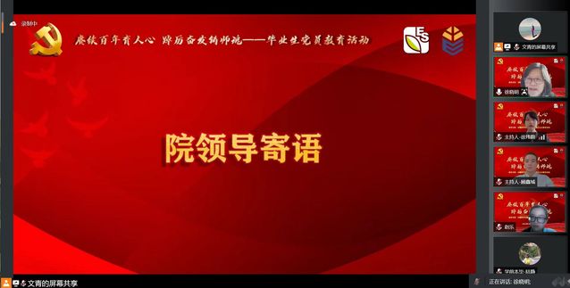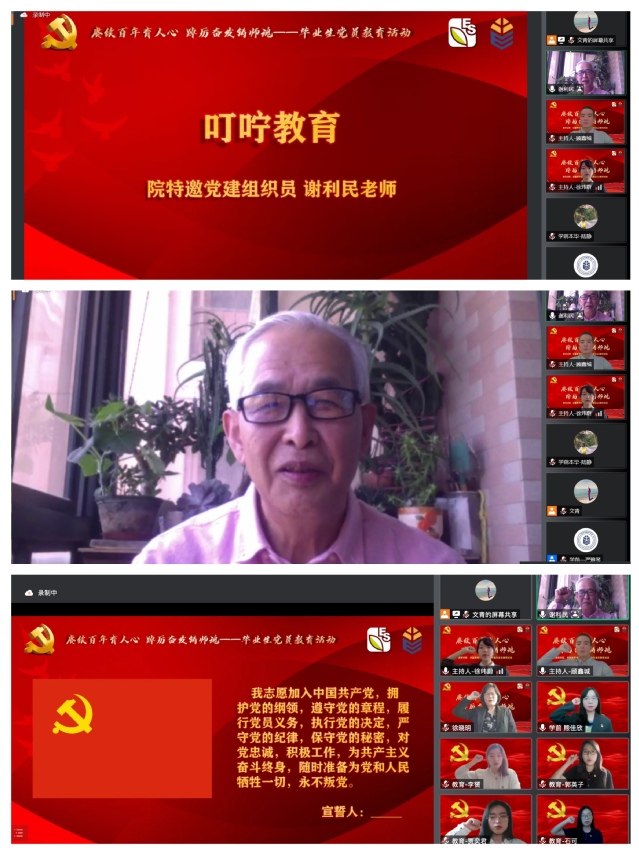 教育学院特邀党建组织员谢利民老师结合自身经历,带领各位学生党员一起回顾自己成为优秀共产党员和模范教师的人生路,并围绕目标与追求、刻苦与努力,吃苦与吃亏、工作与生活四个方面,对即将走出校园迈向新征程的党员同学们提出真诚希望,勉励全体毕业生党员能够永葆初心,坚定目标,在平凡中做出不平凡的事业,谱写属于自己的青春华章。
