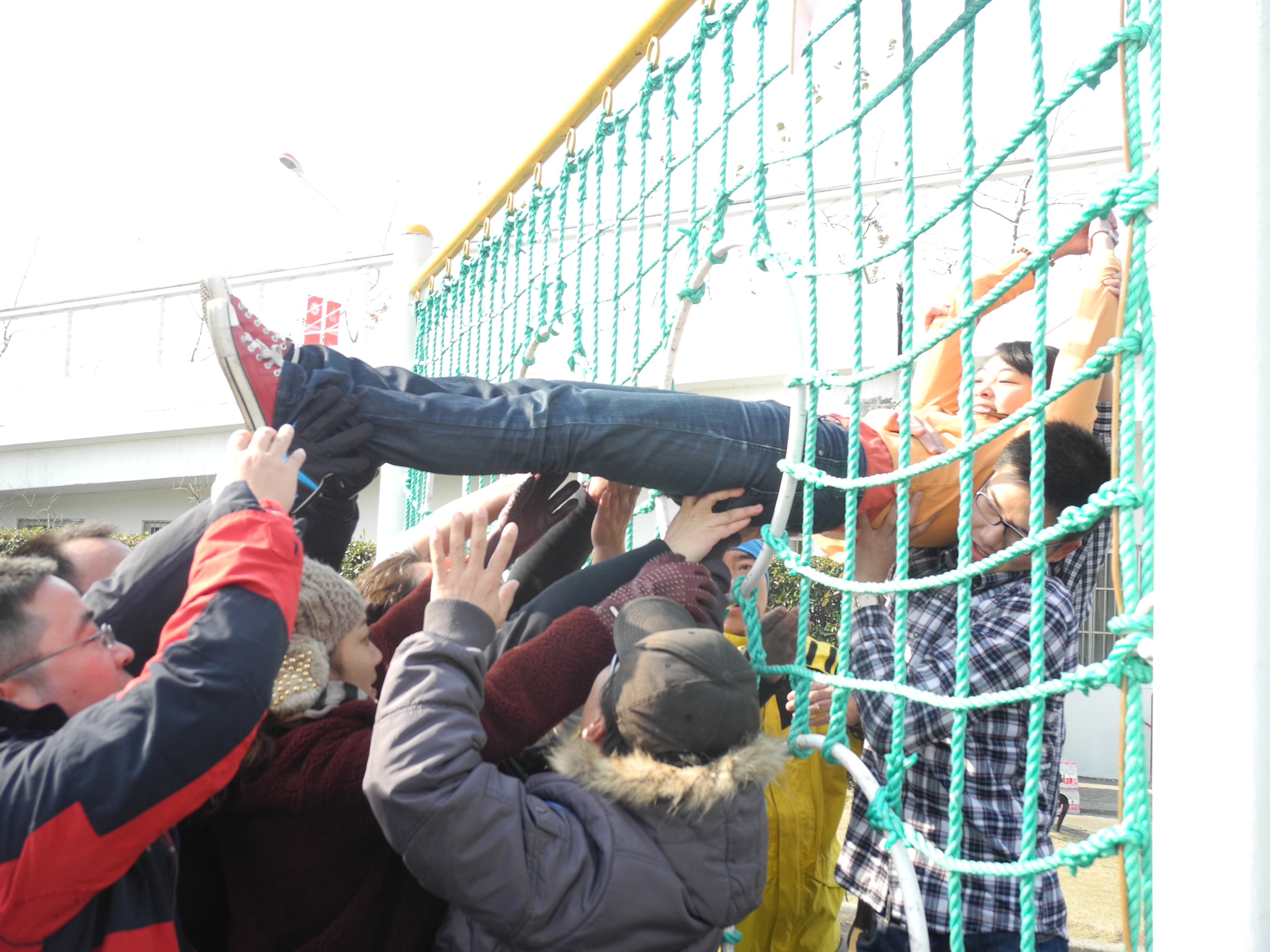 抵达拓展基地后,老师们在教练带领下进行了热身运动并在活动中随机分组,由各组分别命名为太阳队、苹果队和红星队。在规定的时间内,各组队员群策群力,快速创建并演绎了各自的队名、队歌、吉祥物以及队呼并推选出了组长。在教练的指导下,队员们开展了礼让通行、穿越电网等拓展活动。现场活动紧张而热烈,掌声、呐喊声、喝彩声此起彼伏。虽然天寒地冻,但大家热火朝天,许多人为确保安全过关还纷纷脱下厚外套,发挥了不怕苦、不怕累的精神。通过快速反应、智慧应对、互帮互助,大家齐心协力最终顺利完成了各个活动。拓展活动完成后,在教练的引导下,大家共同总结了作为一个团队要顺利完成任务、达成目标的诸多要素:团结、沟通、协作、信任、换位思考、突破思维局限、全局观念……看似简单的活动,却让人回味、发人深省。拓展活动结束后,老师们还集体参观了位于航母内的国家安全教育馆。
