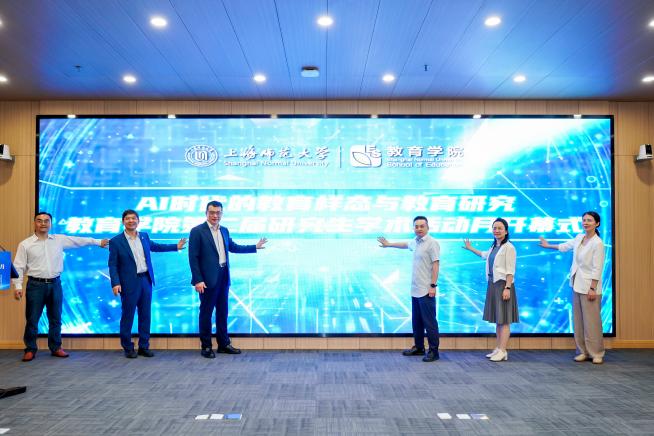 与会嘉宾共同为教育学院第二届“研究生学术活动月”揭幕。教育学院AI形象代言人“师小育”详细介绍了本届学术月的活动安排,涵盖学术讲座、研讨交流、实践创新等多元板块,为师生参与学术活动提供清晰指引,激发了师生参与学术探索的热情。
