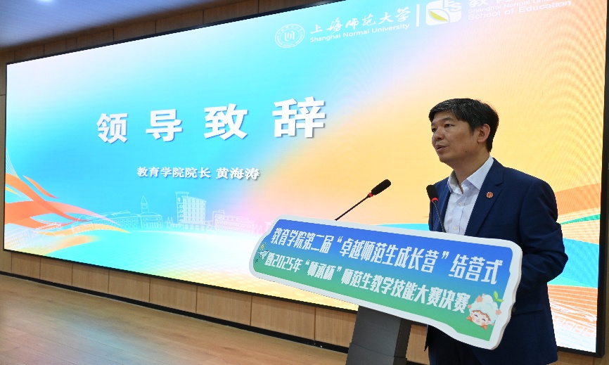 为深入贯彻新时代教育强国战略,全面提升我院师范生的专业技能水平,5月14日下午,教育学院于徐汇校区教苑楼B107隆重举办第二届“卓越师范生成长营”结营式暨2025年“师承杯”师范生教学技能大赛决赛。活动邀请基础教育领域杰出名师担任评委,教育学院院长黄海涛、校教务处副处长杨帆、基础教育处副处长李晓芳、教育学院领导班子成员及各系骨干教师代表出席本次活动。