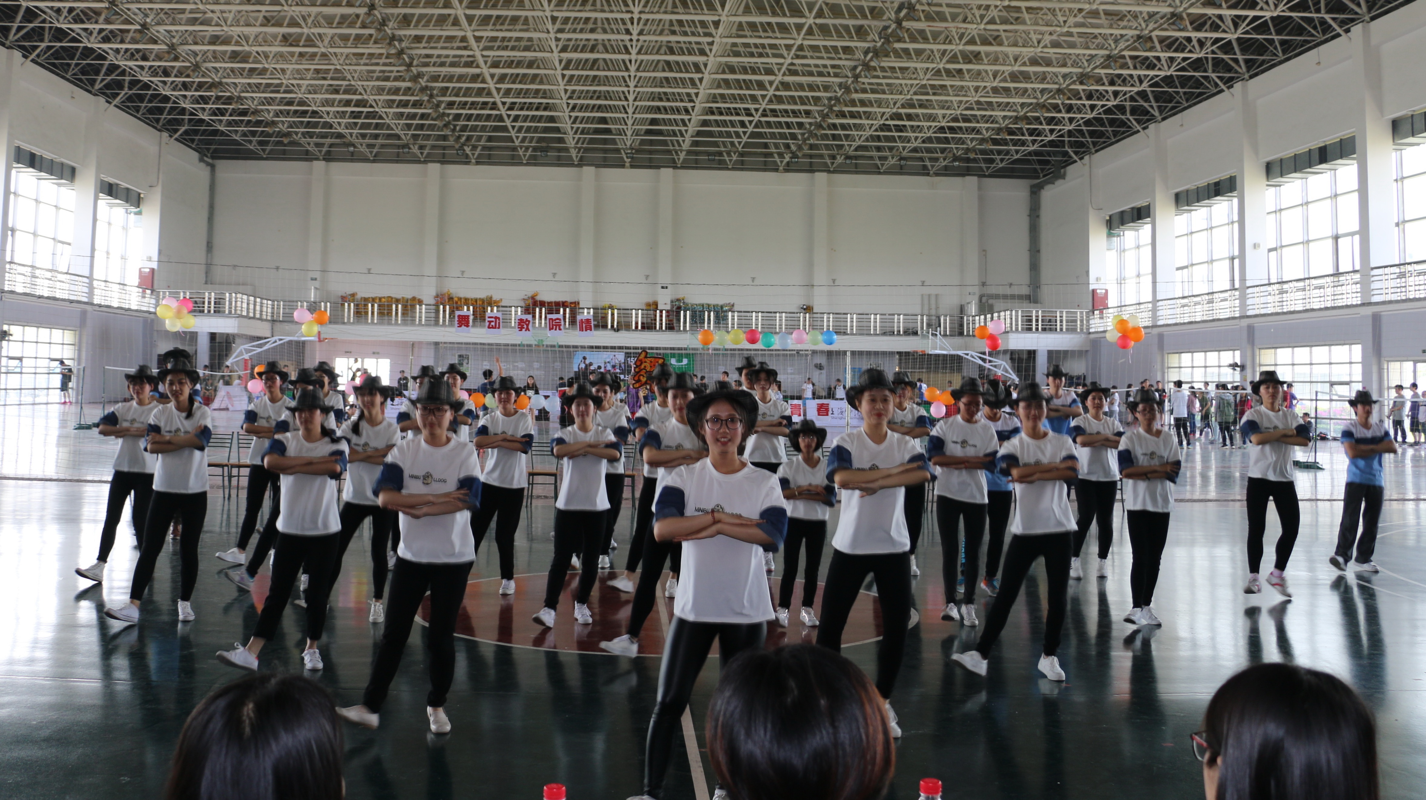 有一种青春的激情需要舞动,有一种集体的力量势不可挡。2016年5月4日下午1时,我院本科生集体舞大赛在奉贤校区南操体育馆顺利开展。本次大赛的评委老师有学院学前教育系专业老师吴珺老师、13级辅导员王凌霏老师、15级辅导员陆超老师以及DT街舞社资深社员宋洁璇。出席本次大赛的嘉宾有学院院办副主任张裕萍老师,学前教育系老师赵燕老师,学院奉贤校区学工办负责人、15级辅导员胡斌老师,学院分团委副书记、14级辅导员黄琼萃老师和14级辅导员许义老师。学院14级本科全体班级参加本次集体舞大赛。