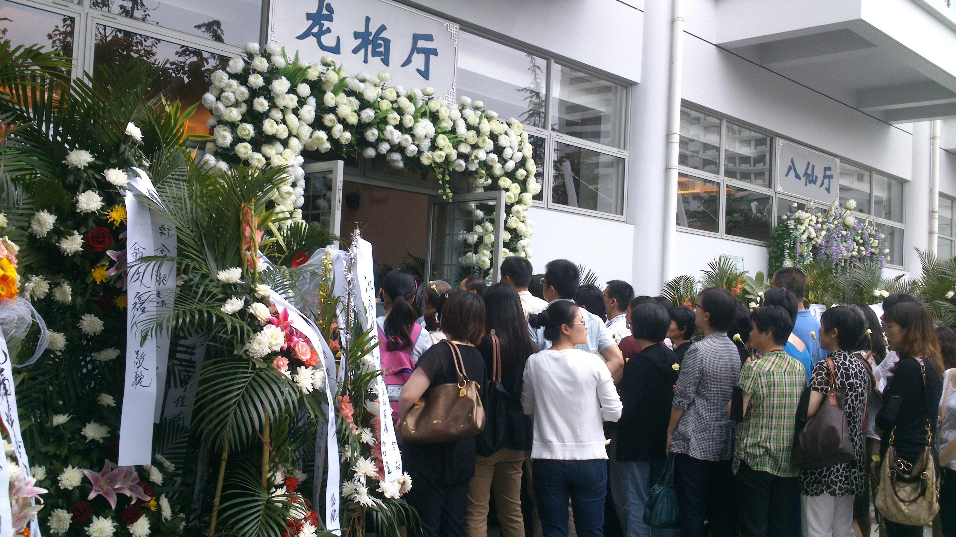 龙华殡仪馆龙柏厅内,庄严肃穆,哀乐低回。大厅中央上方悬挂着黑底白字的横幅“沉痛悼念张志刚同志”,横幅下方是张志刚的遗像,张志刚的遗体安卧在鲜花翠柏丛中。