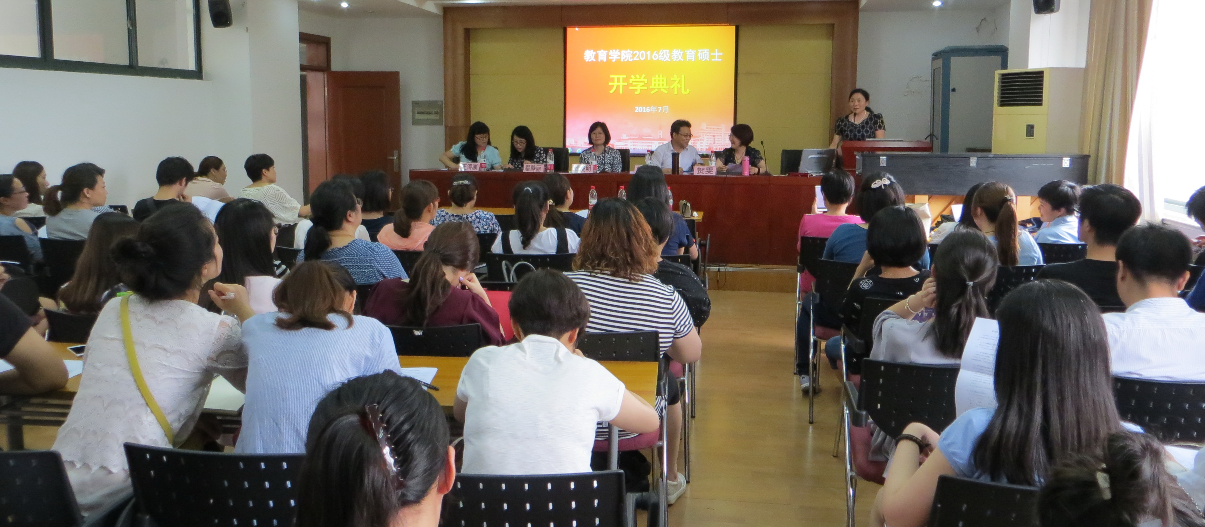 仅隔两天,教育学院又迎来了77位攻读在职教育硕士的新学员。7月2号下午3:00,教育学院2016级在职教育硕士开学典礼在教苑楼B401举行。学院领导徐晓明书记出席了典礼,参加典礼的还有在职教育硕士的4个专业主任蔡宝来教授、翟静丽副教授、王海澜副教授、贺雯副教授及专业硕士管理办公室的老师。