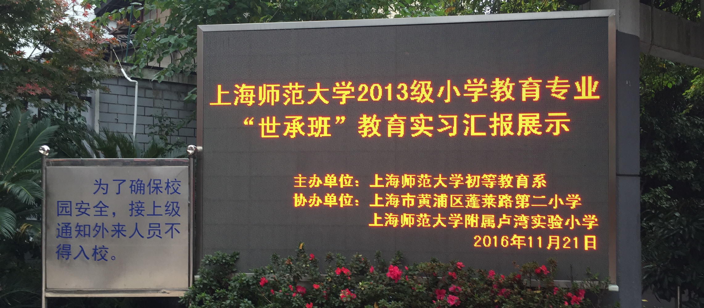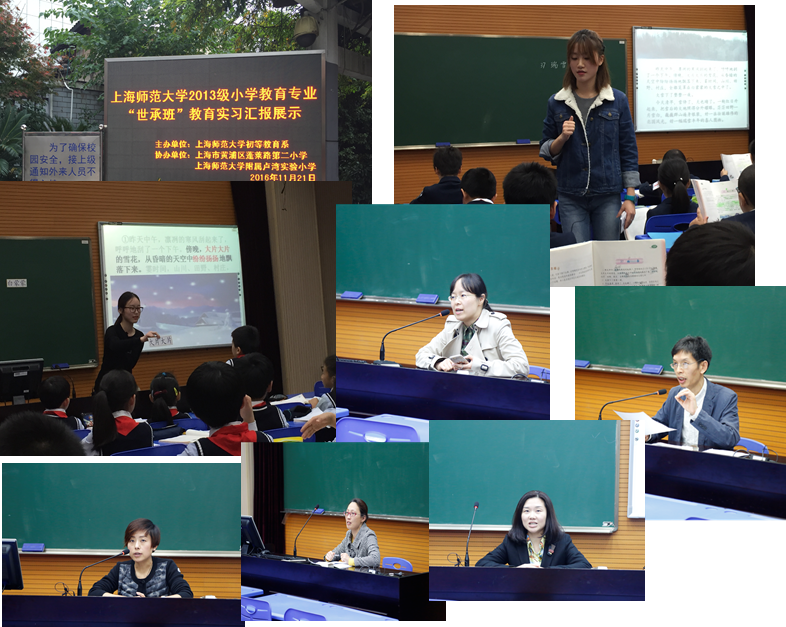 2016年11月21日下午,上海师范大学2013级小学教育专业“世承班”教育实习汇报展示活动在蓬莱路第二小学举行。本次展示活动由上师大初等教育系主办,蓬莱路第二小学和上师大附属卢湾实验小学协办,展示活动由上海师范大学初等教育系钟文芳老师主持,蓬莱路第二小学和上海师范大学附属卢湾实验小学的领导和指导老师、2013级小学教育专业“世承班”全体实习生参加了本次活动。