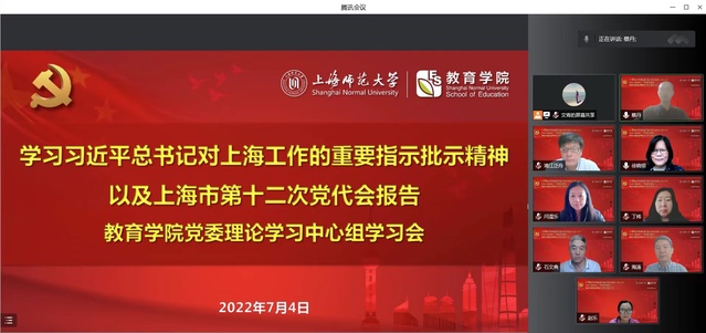 根据校党委部署,7月4日上午,教育学院党委以视频会议形式举行在线中心组理论学习,学习习近平总书记对上海工作的重要指示批示精神和上海市第十二次党代会精神。学院党委中心组全体成员参加。会议由院党委书记徐晓明主持。