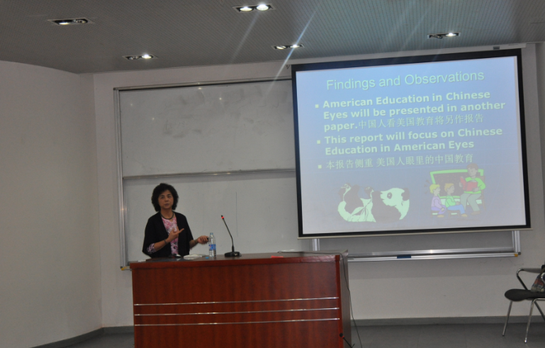 其后,加州州立大学北岭分校中国所所长苏智欣教授作了题为“美国人看中国教育 (Chinese Education through Americans Eyes)”的讲座。苏教授指出,美国和中国教育都处于改革的十字路口,但是两个国家的教育改革却在朝两个不同的方向发展。她通过中美教育目标及重点、语言学习的要求、对待特殊教育的态度、学前教育的侧重点、课堂的设置、装饰和氛围等方面比较了现阶段两国教育的差异,重点讲解了中国教育中课程和教学的关键问题,展示了美国视角下的中国教育。