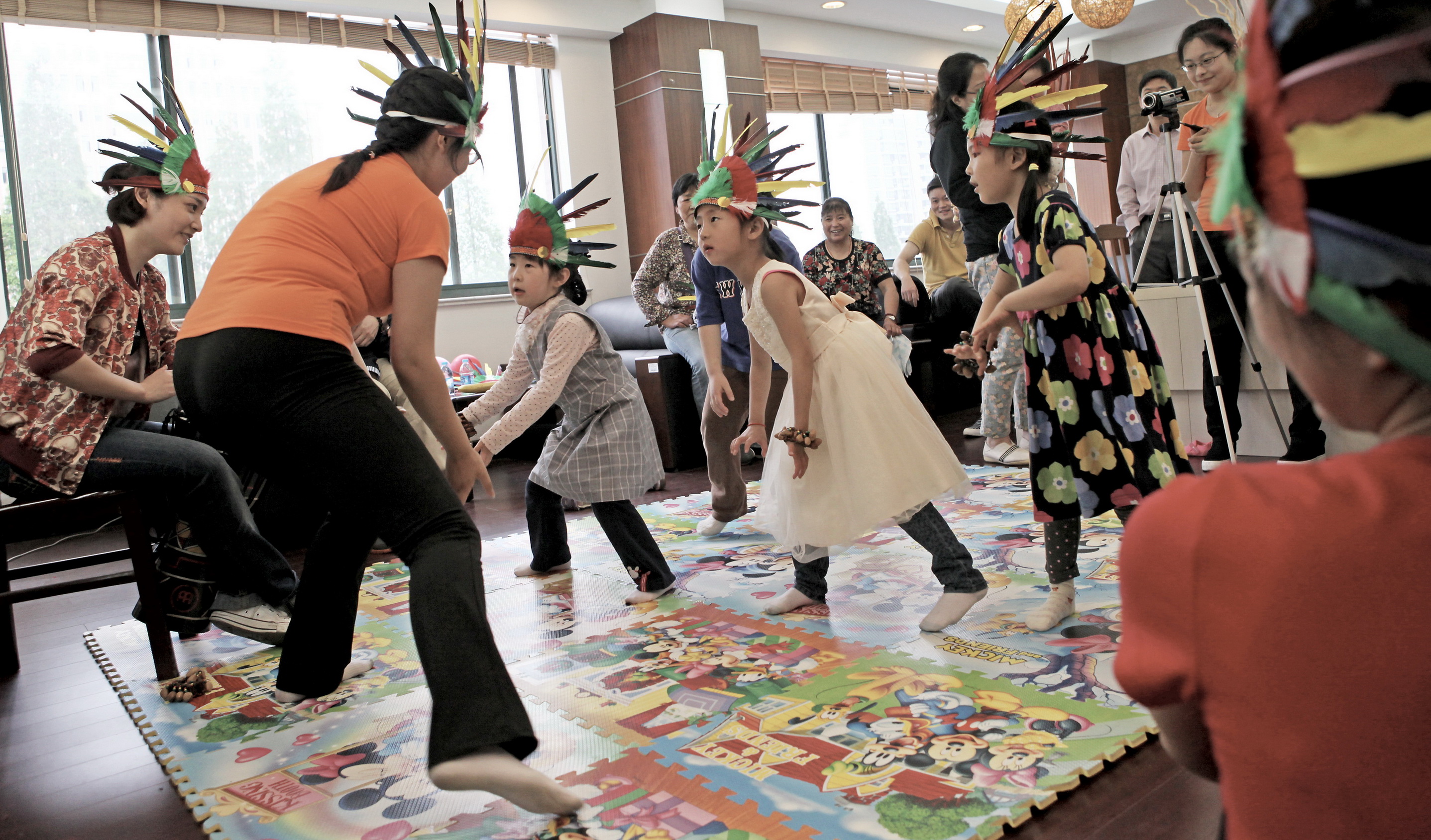 在黎松涛、金钧与陈敏燕老师的精心布置下,工会活动室顿时充满了节日的欢乐气氛。首先是13级学前专业学生带领孩子们进行了欢快热烈的“非洲精灵”律动操。在吴珺老师粗犷有力的手鼓伴奏下,孩子们尽情舞动,体验了一把非洲舞蹈的质朴与奔放。随后汪磊老师与小助手们为孩子们带来了有趣的亲子拓印彩绘活动,美丽的非洲纹样图章与形状各异的落叶,在画纸与孩子们的手臂上留下了斑斓跳跃的色彩。在互动游戏环节,何慧华老师请来了早教中心的老师为孩子们送上有趣的吹泡泡游戏。