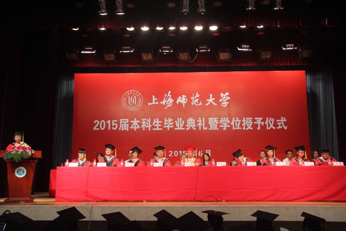 雄壮的国歌声后,教育学院党委书记周银娥老师为全体毕业生致辞,周老师将亲切的祝福、殷切的希望送给毕业生们,希望大家在崭新的人生旅程中,胸怀梦想、肩负使命、勇于践行。随后进行了2015年上海市高等学校优秀毕业生和上海师范大学优秀毕业生的表彰。在教师代表和学生代表发言之后,是庄重的学士学位授予仪式。之后,毕业生们庄严宣誓,毕业后将以才智服务社会,在未来的岗位上奉献青春!最后,全体毕业生以深深地一鞠躬表达了对家长及教师们的感恩之情,与同学彼此拥抱,互相感谢、祝福。