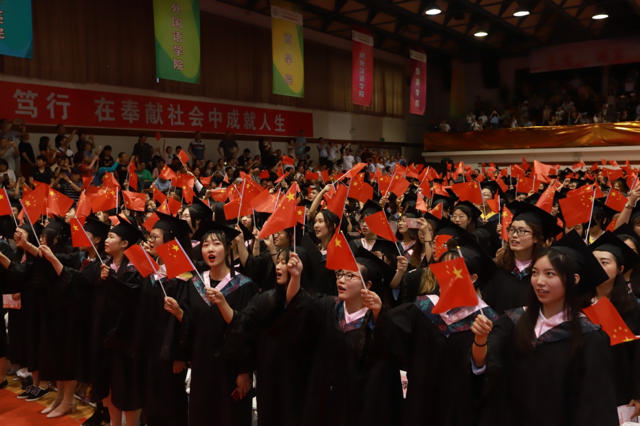 最后,全场师生挥动国旗,齐唱《我和我的祖国》,毕业典礼在高昂的歌声中落下帷幕。今年适逢建国70周年、建校65周年,立身于崭新的历史时代,衷心祝愿每一位教院学子于时代大潮中常持育人情,常怀追梦心,不断奋斗,永远奋斗,开启属于自己的人生新篇章!