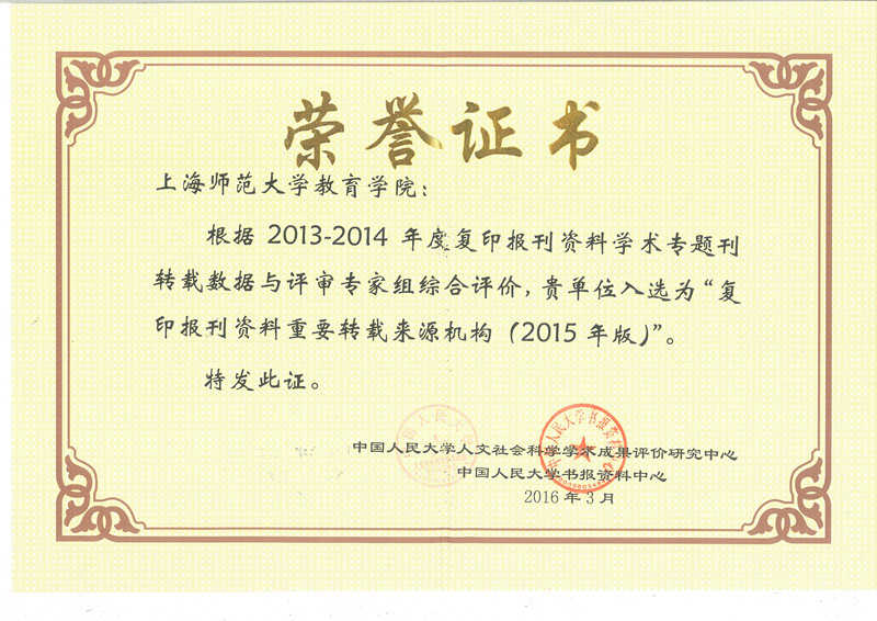 2015年度“复印报刊资料重要转载来源机构”是根据人大《复印报刊资料》100多种学术系列刊的全文转载数据,从转载量、综合指数统计得出排名,收集了教育学科高等院校898篇转载全文,约占教育学科转载总数(1176篇)的76.4%,涉及高等院校214所,约占教育学科涉及作者机构总数(383个)的55.9%。人大《复印报刊资料》已经成为评价人文社科期刊学术影响力和人文社科研究成果水平的参考依据之一。
