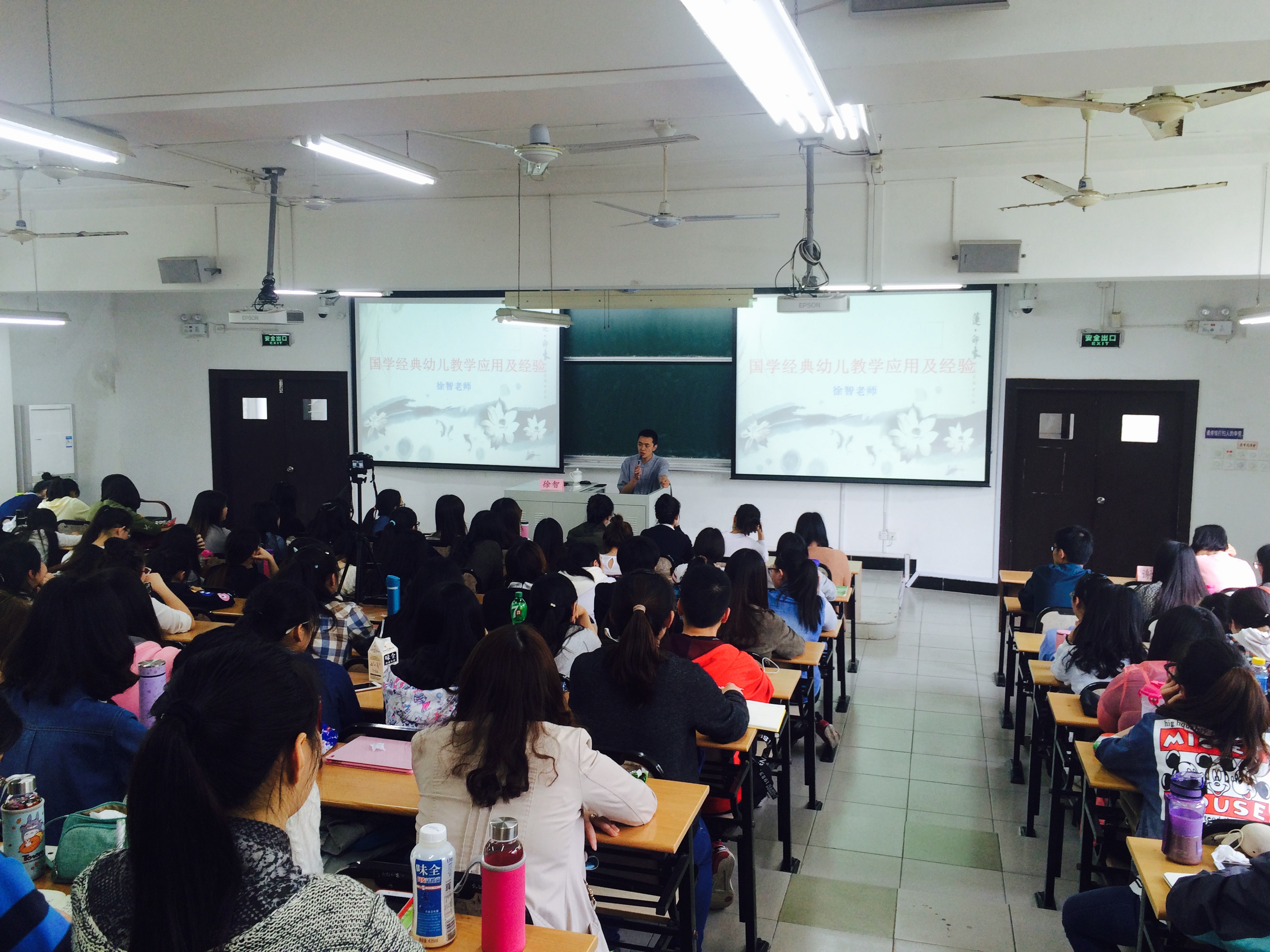 幼儿养性,童蒙养正,慎之于始对于幼儿教育极为重要,将国学经典融入幼儿启蒙教育,将古圣先贤的智慧注入孩子的成长,才能真正帮助孩子启迪人生智慧、陶冶纯美性灵,建构起终身受益的品格磐基。为了帮助13级学前教育专业本科生进一步了解当前幼儿国学教育的发展与前景,更好地认识到幼儿阶段开展国学启蒙教育对于孩子良好行为习惯的培养与性格塑造的重要性,5月11日下午,学院邀请北京汇贤雅国学讲师徐智老师为近两百名学前教育同学做主题为“国学经典幼儿教学应用及经验”讲座,讲座由学院副书记、副院长谢青老师主持。