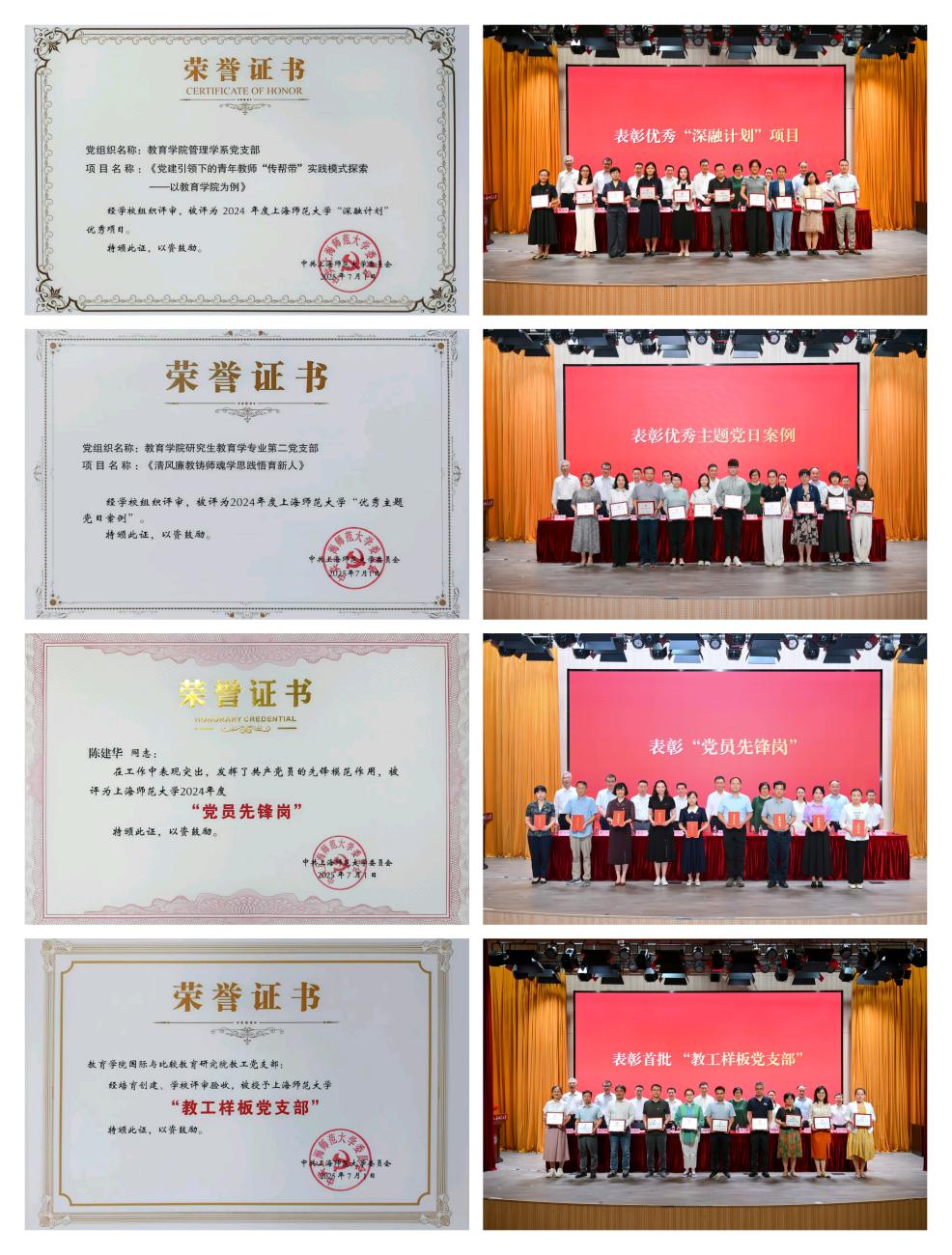 在此次座谈会中,我院多项工作获得表彰。管理学系党支部《党建引领下的青年教师“传帮带”实践模式探索——以教育学院为例》被评为2024年度上海师范大学“深融计划”优秀项目;研究生教育学专业第二党支部的《清风廉教铸师魂 学思践悟育新人》被评为2024年度上海师范大学“优秀主题党日案例”;教育学系党支部陈建华同志因工作表现突出,被评为上海师范大学2024年度“党员先锋岗”。国际与比较教育研究院党支部经培育创建和学校评审验收,被授予上海师范大学“教工样板党支部”称号。