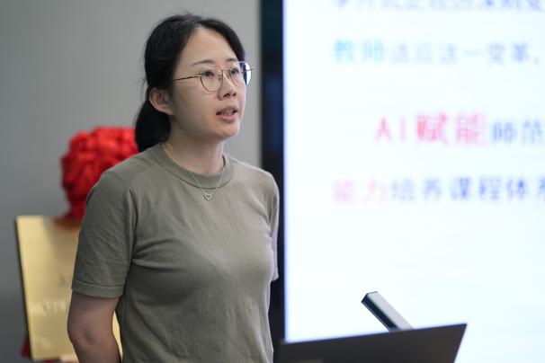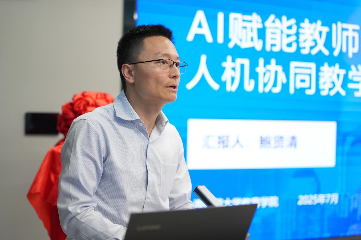 项目负责人鲍贤清介绍了培养体系的四门核心课程。《AI辅助教学设计原理与实践》聚焦人机协同备课策略;《多模态教学资源AI生成与应用》提升数字教材制作能力;《AI支持的教学评估与反馈》构建数据驱动的课堂诊断模型;《AI驱动教育创新项目设计》培养跨学科项目创新能力。四门课程将与学院教师胜任力评价体系和联盟校真实课堂深度融合,形成“校内学习—校外实训—线上反馈—循环提升”的完整培养链。