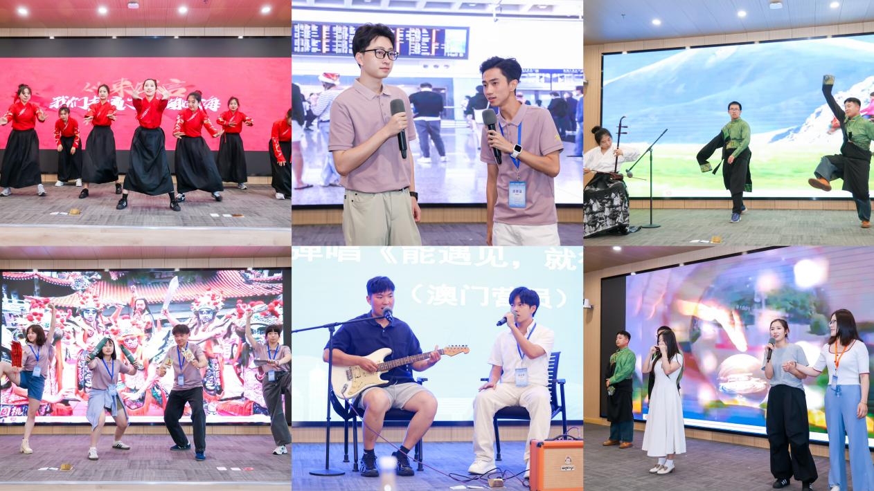 闭营仪式的风采展示环节,表演形式纷呈、四地文化荟萃、青年情谊绵长。我校教育学院志愿者以活力四射的国风舞蹈《山河图》精彩开场,又压轴表演了歌舞乐器串烧《赛马》《友谊天长地久》,带给大家视听享受的同时传递着美好的期盼和祝愿。台湾营员用舞台剧《阵头》讲述了青年在传统民俗表演的鼓舞下励志成长的故事,表演独特,直击人心。澳门营员一曲吉他弹唱《能遇见,就很不错了》,娓娓诉说相遇的珍贵和离别的不舍,悄然拨动众人心弦。香港营员的《情缘永续》以时空穿越的情景演绎,发出“缘起浦江 情续香江”的诚挚邀请,让大家不由心向往之。