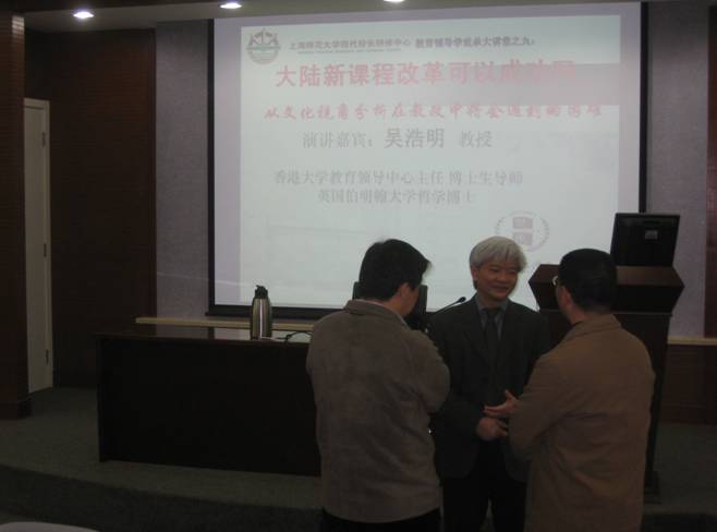 4月8日上午现代校长研修中心教育领导学世承大讲堂第九讲在第四教学楼一楼学术报告厅举行。香港大学教育领导研究中心主任、英国伯明翰大学哲学博士吴浩明教授应邀主讲“大陆新课程改革可以成功吗?——从文化视角分析在教改中可能会遇到的困难”。吴教授从课程改革与教师关系为分析对象,从教师的知识、信念、实践为分析维度,通过香港与内地“一课两讲”的教育研究与教师专业发展实验为案例,深入浅出地解读了制约课程改革的教师信念因素。吴教授指出,教师教育信念形成及其构成,与社会文化传统密切相联。这一点在他主持的“一课两讲”的教育实验中得到了验证。报告提出对课程变革的文化反思,旨在实现课程改革、教育改革的本土化目标。