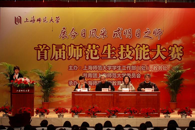 2011413中午1230,以“展今日风采、成明日之师”为主题的上海师范大学首届师范生技能大赛开幕式在徐汇校区东部礼堂隆重举行。本次活动由上海师范大学学生工作部(处)、上海师范大学教务处、共青团上海师范大学委员会共同主办,教育学院承办。出席今天开幕式的领导有学生工作部部长张文潮老师、教务处处长刘民刚老师、教育学院院长陈永明教授以及教育学院党委副书记、副院长谢青老师。