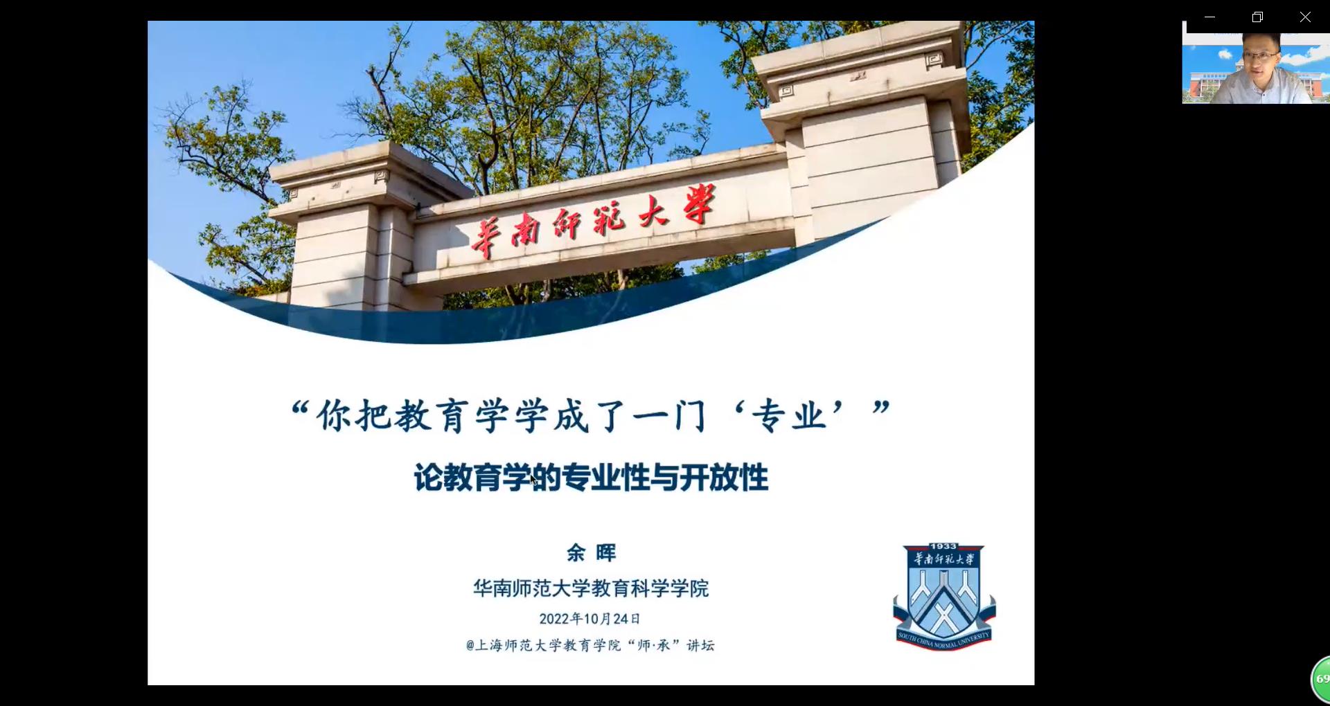 2022年10月24日晚,伟德国际BETVlCTOR“师•承”讲坛第二讲顺利举行。主讲人华南师范大学教育科学学院余晖副教授就《“你把教育学学成了一门‘专业’”:论教育学的专业性与开放性》进行了专题汇报。讲座由教育学系陈婧博士主持,由教育学系毛丹副教授担任与谈人。