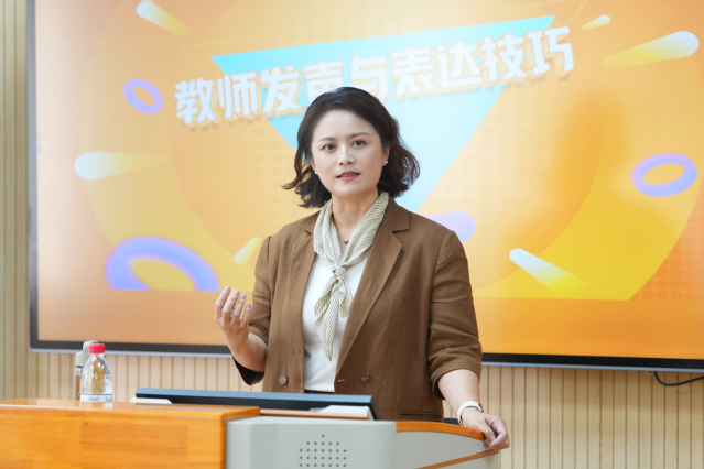 在工作坊第二环节,现场教师进行了试讲,她逐一给予点评并提出针对性建议。教学行为是一门表演艺术,教师通过科学和情境性地表达,能直接影响课堂教学效果。后续,她将继续通过线上课程、校本培训等形式,将戏剧发声训练融入教师培养体系,助力更多教育工作者用“有力量、有温度”的声音打造高效课堂。