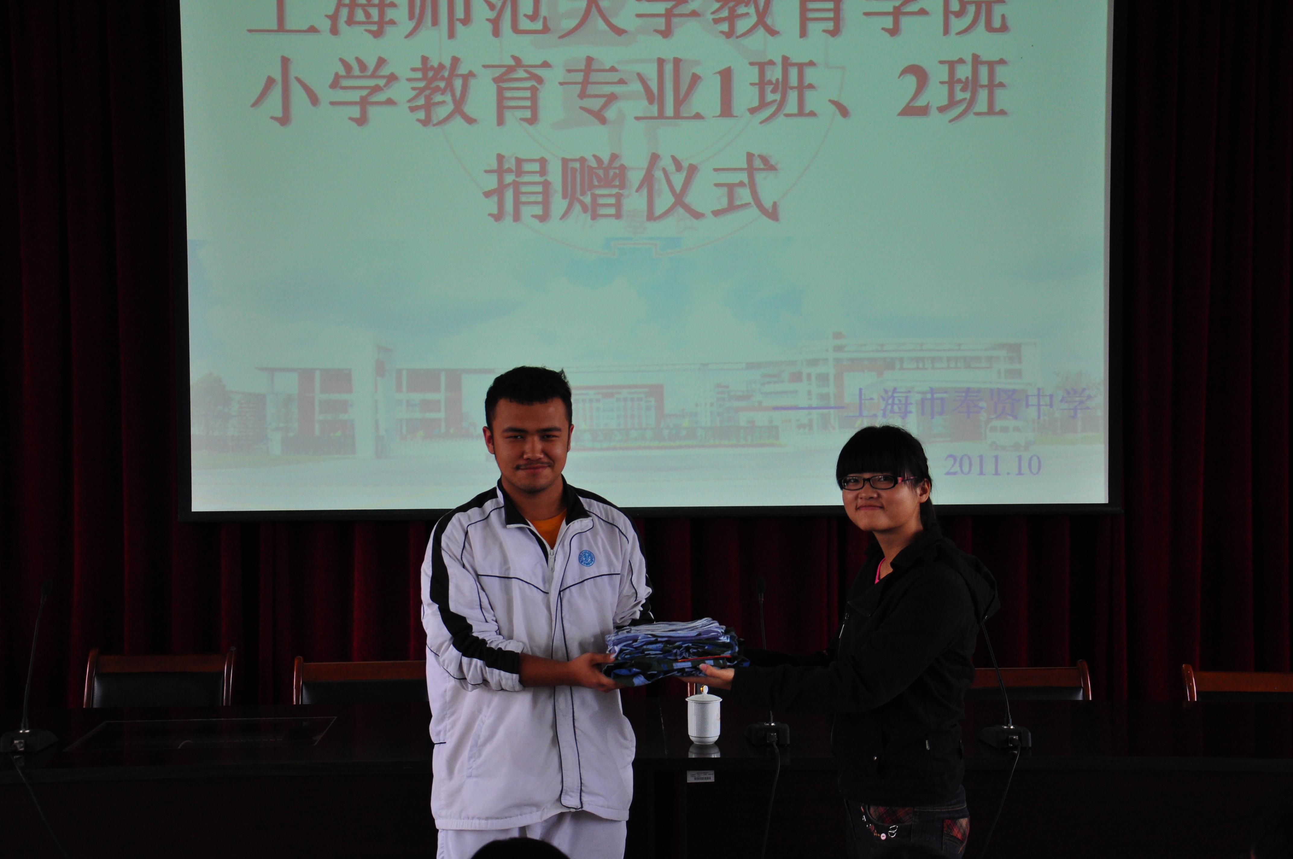 2011年10月26日下午,在上海市奉贤中学多功能厅举行了“伟德国际BETVlCTOR2010级小学教育专业1、2班捐赠仪式”。奉贤中学新疆部部长朱军老师、伟德国际BETVlCTOR团委书记黄琼萃老师、教育学院2010级小学教育专业学生代表出席捐赠仪式。此次捐赠的物品为军训服装共计500余件。