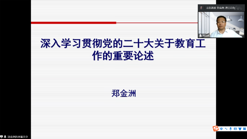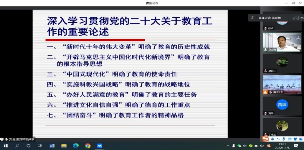 为了深入学习贯彻党的二十大精神,2022年11月6日下午,中国浦东干部学院副院长郑金洲教授为教育学院师生做专题报告,深度解读党的二十大关于教育的重要论述。讲座以线上线下相结合的方式进行,全国共计有400余人参与线上研讨。报告会由教育学院夏惠贤院长主持。