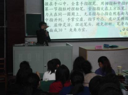 为进一步提高我院小学教育师范生的专业技能,加强师范生的职场竞争力,近期学院为2009级小学教育师范生开设了硬笔书法系列讲座,并于4月25日在东二教室进行了系列讲座的第二讲——关于粉笔字书写的培训。