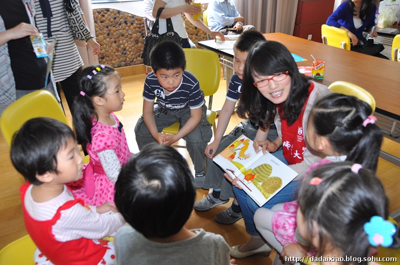本次活动形式是“大带小”团队一直倡导和推广的小组互动式分享阅读——由一名志愿者带领7-8名小朋友一起分享绘本。这次活动尤为特别的是加入了家长观摩的环节,小朋友的爸爸或妈妈可以站在旁边一起聆听志愿者和孩子们的阅读过程,亲自感受这个快乐而有意义的时刻,零距离地感悟分享式阅读的先进理念。