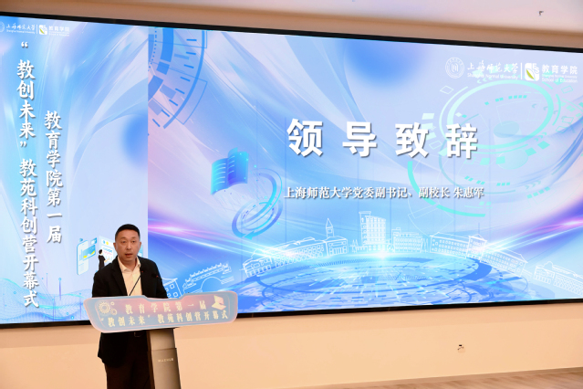 朱惠军为本次启动仪式致辞,他指出,我校始终坚持以立德树人为根本任务,以推动教育创新为己任,努力培养具有家国情怀、创新精神和实践能力的卓越教师与未来教育家。他充分肯定了近年来教育学院在学生科创赛事上取得的不俗成绩,寄语同学们要紧握时代机遇,勇于“破圈出圈”、坚持“问题导向”、学会“团队作战”,在“教创未来”的旅程中,不仅收获知识与技能,更能培养系统性思维、塑造坚韧品格与凝聚团队精神,真正成长为“会创新、能育人”的时代新人。