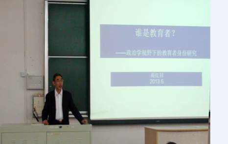 2013年6月13日下午在我校西一教室,法政学院院长——商红日教授为我院2012级两百多名研究生及博士生做了一场题为“谁是教育者—政治学视野下的教育者身份研究”的讲座。我院部分青年教师出席此次学术讲座。