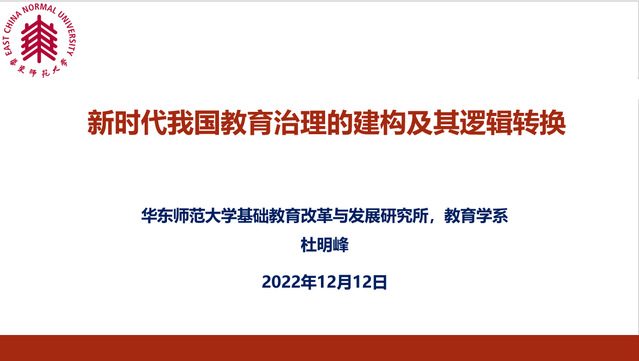 2022年12月12日,伟德国际BETVlCTOR“师·承”讲坛特邀华东师范大学教育学部杜明峰副教授就《新时代我国教育治理的建构及其逻辑转换》进行在线专题汇报。讲座由我院陈静静副教授作为与谈人,陈婧博士担任主持工作。