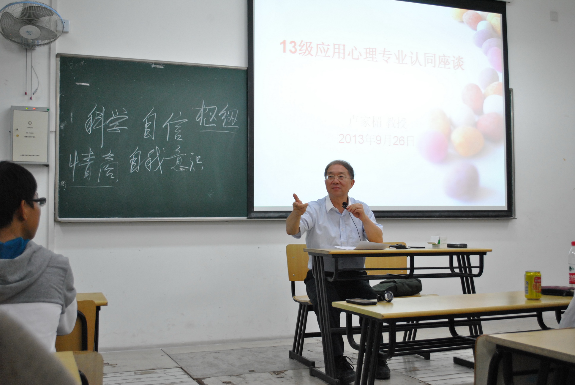 9月26日晚上,国家教学名师、中国心理学会常务理事卢家楣教授与2013级应用心理学系学生开展了一次面对面的专业认同座谈会。此次活动是应用心理系新生专业认同教育的重要组成部分之一。