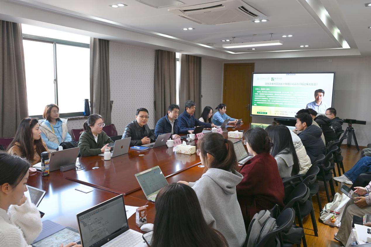 2025年11月21日上午,华中科技大学教育科学研究院院长、博士生导师陈廷柱教授应邀做客教育学院“师承名家讲坛”,作题为“强化企业科技创新主体地位对高等学校意味着什么”的专题报告。教育学院院长黄海涛教授担任与谈嘉宾,讲座由教育学院副院长张继龙副教授主持。