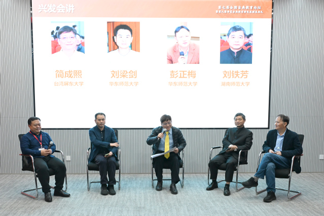 大会报告结束后,简成熙、刘梁剑、彭正梅、刘铁芳四位教授共同兴发会讲,四位教授探讨了“兴发”在教育中的定位、与想象力的关系及后续走向,强调“兴发”对生命塑造的意义。