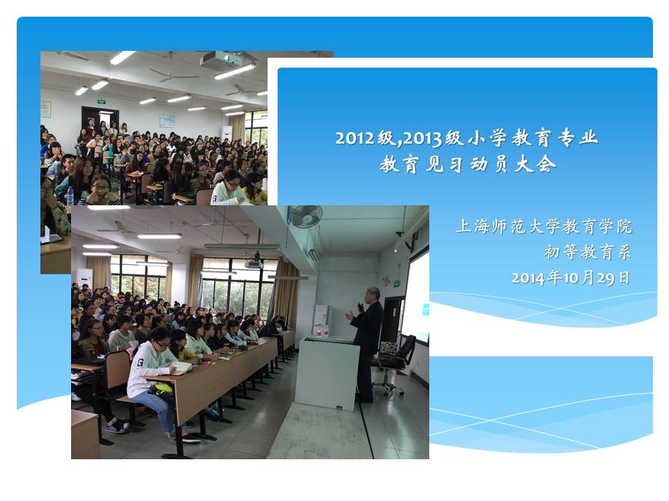 2014.10.29下午,教育学院初等教育系在奉贤校区二教221举行了2012级和2013级学生的教育见习动员大会。参加会议的有初等教育系副系主任钟文芳老师、小学教育研究所所长杨庆余老师、各教育见习基地学校的带队老师,以及即将参加见习的2012级和2013级小教专业的三百六十名本科生。