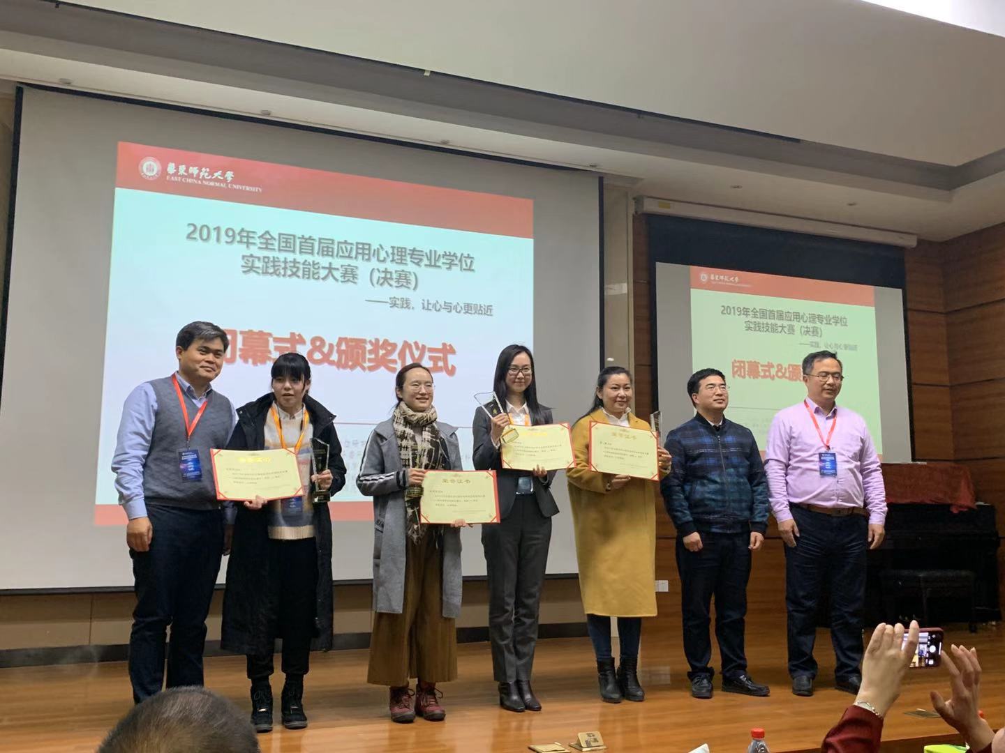 2019年12月6日,首届全国应用心理专业学位实践技能大赛(决赛)在华东师范大学心理与认知科学学院俊秀楼报告厅落下帷幕。在心理咨询面谈技能比赛环节中,心理系2018级应用心理专业硕士研究生姚书红从决赛中脱颖而出,荣获一等奖;刘世宏副教授荣获优秀指导教师奖;范为桥教授指导的赵泽文团队获得全国应用心理实践技能大赛案例开发组三等奖;陈宁教授指导的段涛团队获得全国应用心理实践技能大赛教学培训组三等奖;教育学院心理系荣获优秀组织奖。