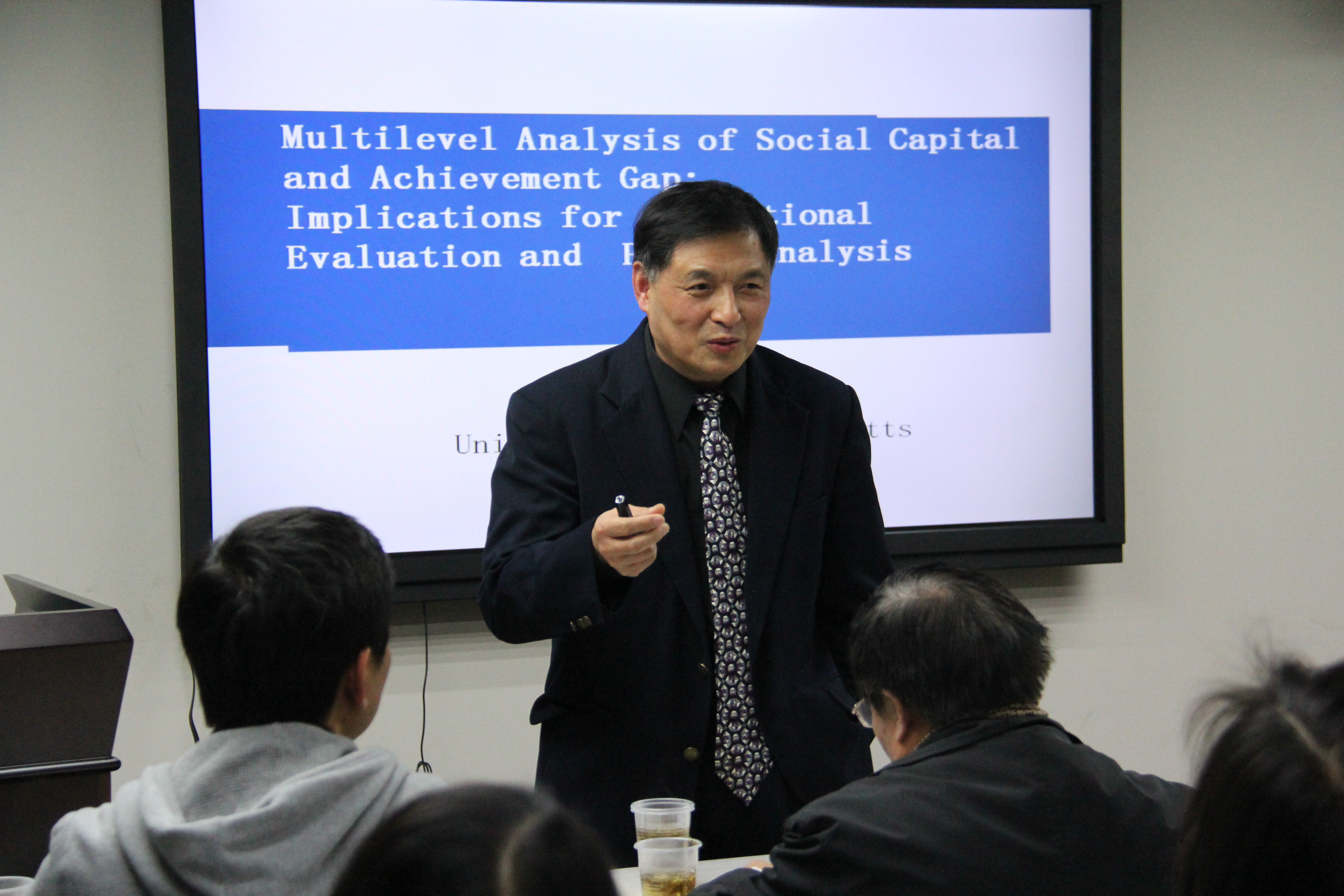 2014年12月15日,马萨诸塞大学教育领导系主任严文蕃教授来我校,作了“Multilevel Analysis of Social Capital and Achievement Gap: Implications for Educational Evaluation and Policy Analysis”的专题报告,教育管理系研究生和部分教师聆听了报告。