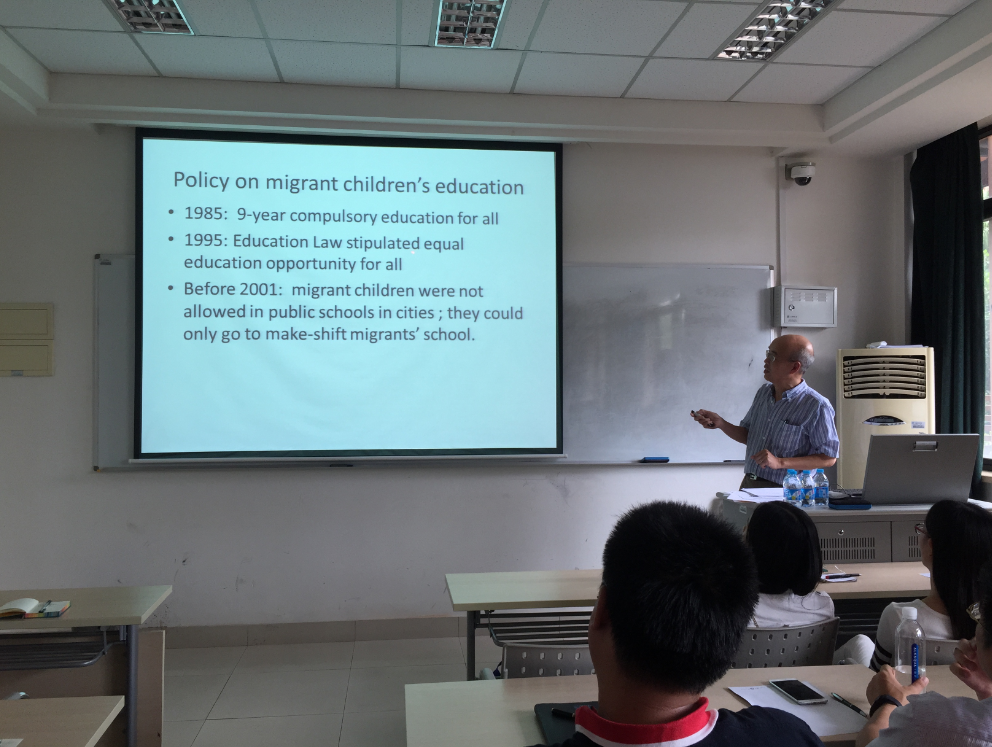 2015年9月18日下午一点,美国华盛顿大学陈金永(Kam Wing Chan)教授在我校四教107室举办了以“城镇化对农村儿童的影响”为题的讲座。本次讲座由我院初等教育系吴艳老师主持,本讲座旨在通过人口分布情况,城镇化的角度来探讨农村儿童的生存和教育问题。
