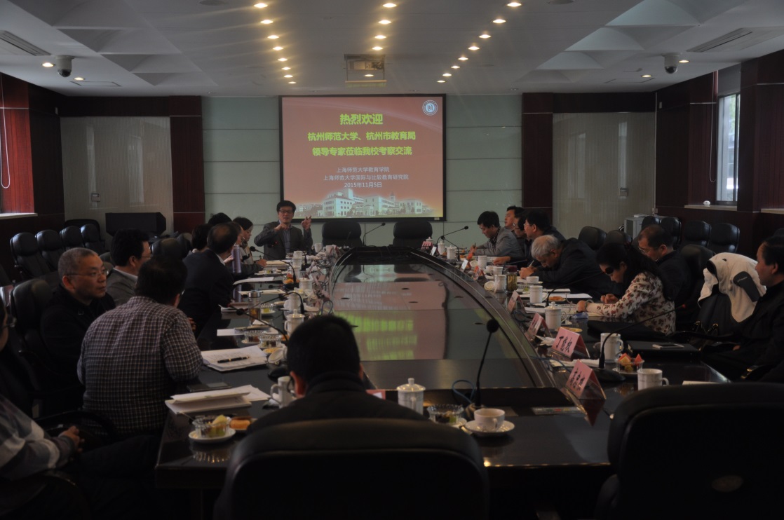 2015年11月5日,杭州师范大学党委委员、副校长何俊,杭州市教育局副局长肖锋,杭州市教育局高师处处长孙青峰等一行20人来到上海师范大学,对上海市教师培训相关举措的经验和动向进行调研。教育学院院长夏惠贤,国际与比较教育研究院院长张民选、研究员王洁在外宾楼101会议室接待了代表团。