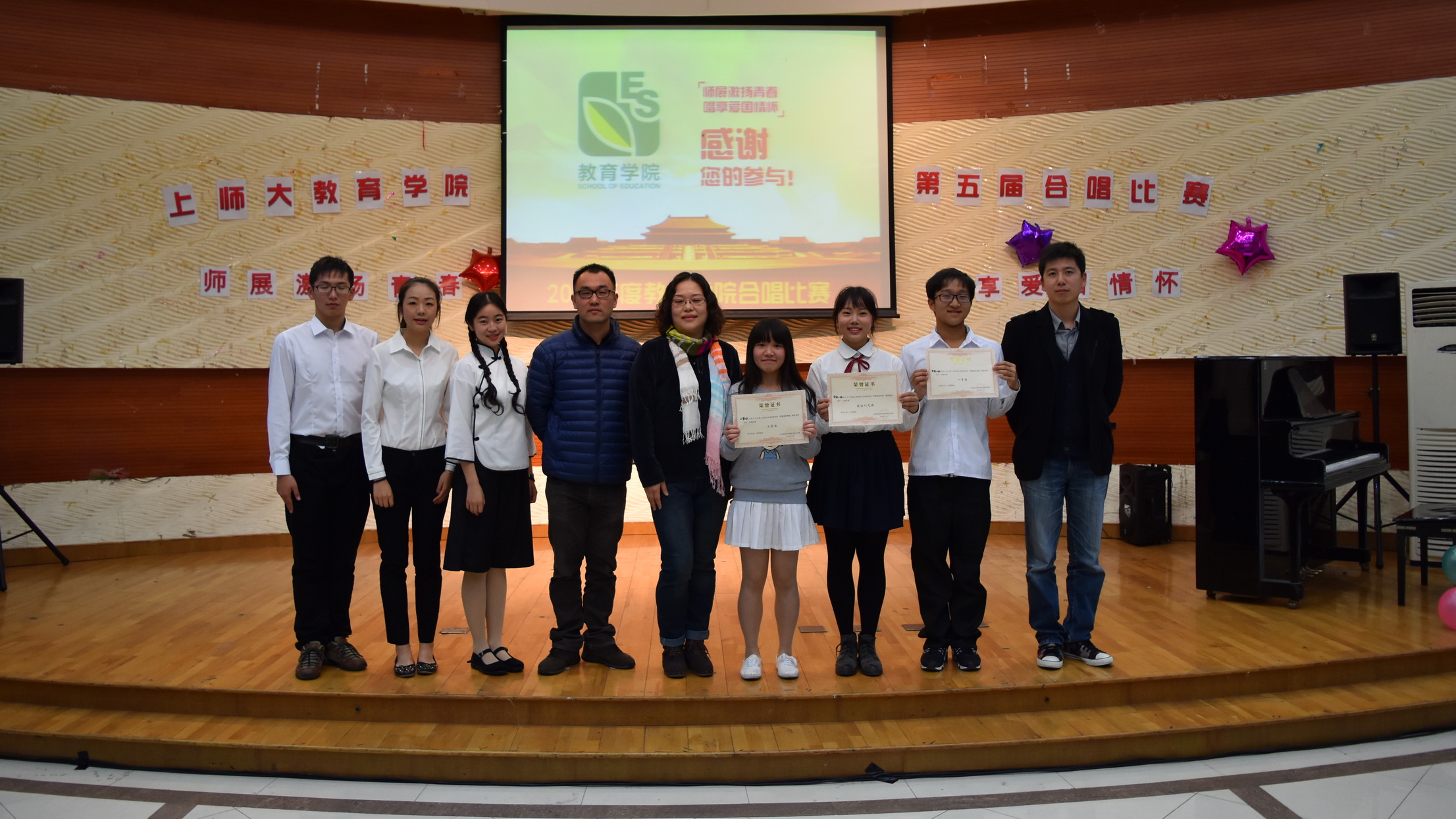 为了在大学生中开展爱国主义教育,弘扬社会主义核心价值观,2015年11月11日下午两点,“师展激扬青春,唱享爱国情怀”第五届教育学院合唱比赛在奉贤校区大学生活动中心顺利开展。我院本科一年级13个行政班级积极备赛、全员参与。此次大赛的评委有学院学前教育系陈敏燕老师,15级小教与公管专业辅导员胡斌老师,14级小教与教育学专业辅导员许义老师,学院学生会主席顾磊,上届学院学生会文艺部部长盛丹妮。