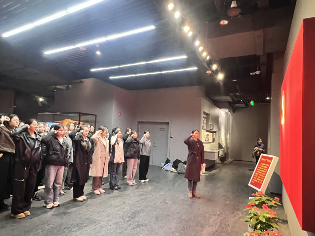 接着,全体师生共同参观了纪念馆基本陈列。透过1500余幅历史照片、400多件珍贵实物及丰富展陈,大家重温了党组织从创立到发展壮大的光辉历程,深刻感悟早期共产党人对党忠诚、严守纪律、勇于牺牲的崇高精神。紧接着,在纪念馆内鲜红的党旗下举行了庄严的入党宣誓仪式。教育学院学生工作负责人潘梦琳领誓,全体新党员高举右拳,面对党旗铿锵有力地宣读入党誓词,表达了为共产主义奋斗终身的坚定决心。