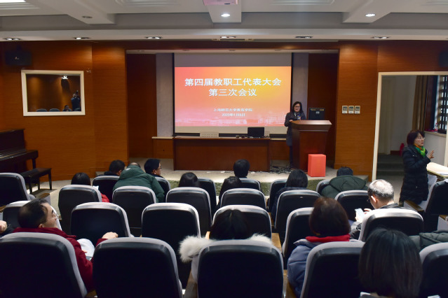 会议在庄严的国歌声中正式开始。院长夏惠贤作《教育学院2019年度行政工作报告》,院领导王健作《教育学院2019年度财务工作报告》,同时就调整行政人员参与超工作量分配办法作了说明。院工会主席贺雯作《教育学院2019年度工会工作报告》,同时向与会代表具体汇报了2019年度学院工会的财务收支使用情况和2020年度工会的财务预算情况。