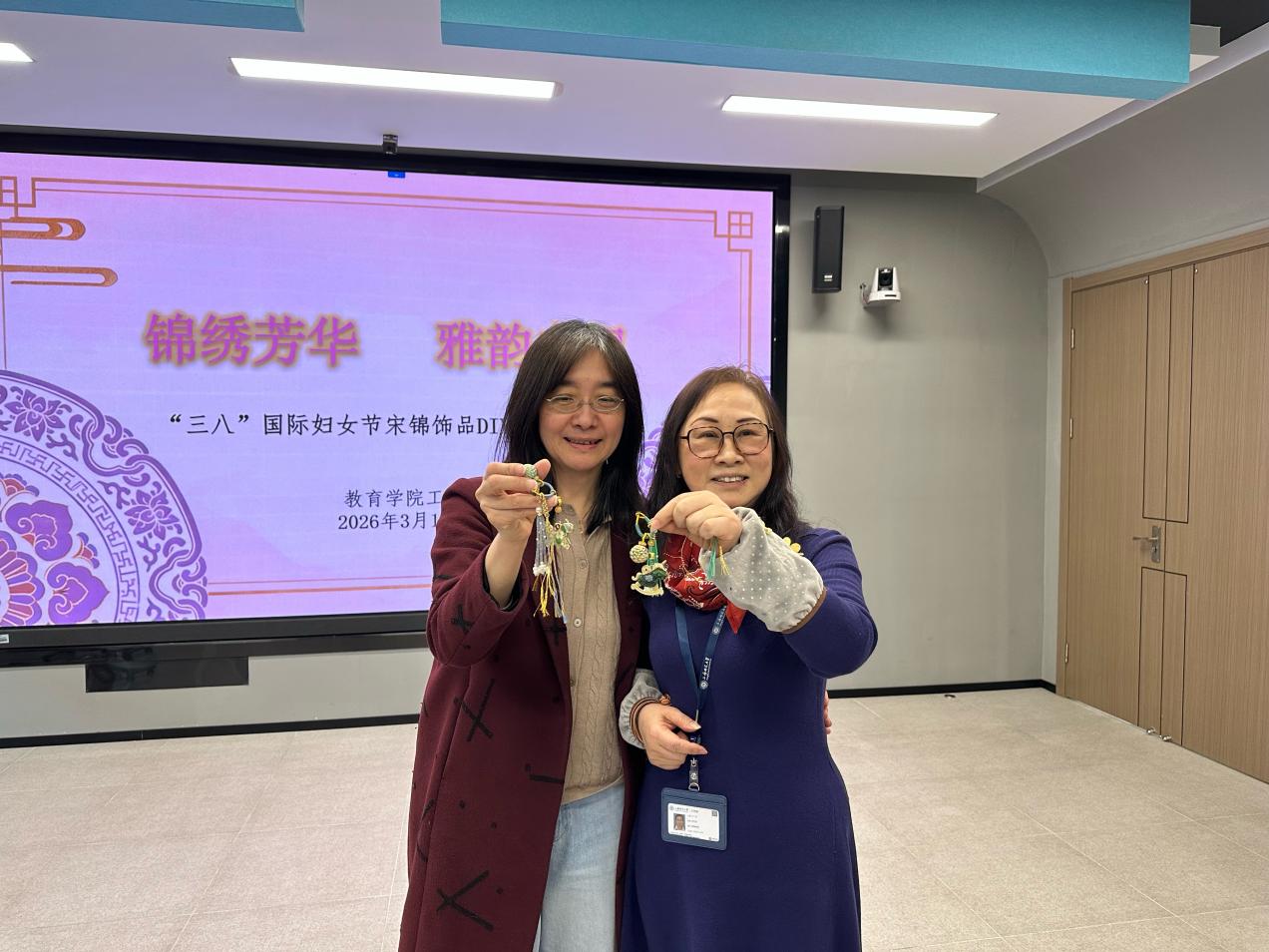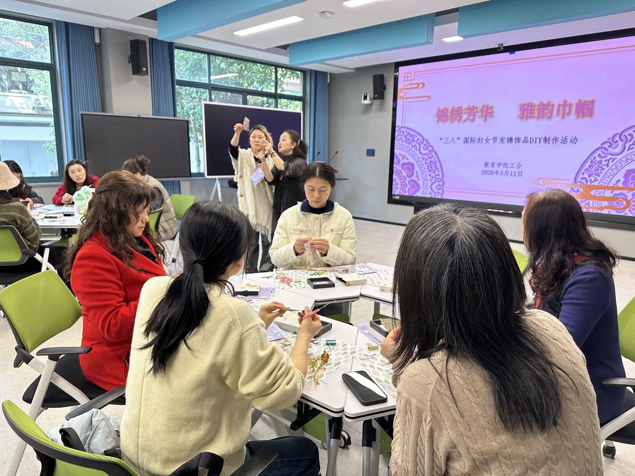 为庆祝“三八”国际劳动妇女节,传承中华优秀传统文化,丰富女教职工精神文化生活,2026年3月11日,教育学院工会精心举办了“锦绣芳华雅韵巾帼”宋锦饰品DIY制作活动,近40位女教职工欢聚一堂,于指尖灵动间探寻非遗匠心,共度专属于女性的温馨惬意时光。活动在轻松愉快的氛围中拉开帷幕。学院工会主席姜辉代表学院,向辛勤耕耘在教学、科研和管理一线的全体女教职工送上节日的问候与祝福,感谢女教职工们以巾帼之姿为学院发展和学生培育作出的重要贡献,希望大家能在此次活动中放松身心、陶冶情操,感受传统美学的独特韵味。