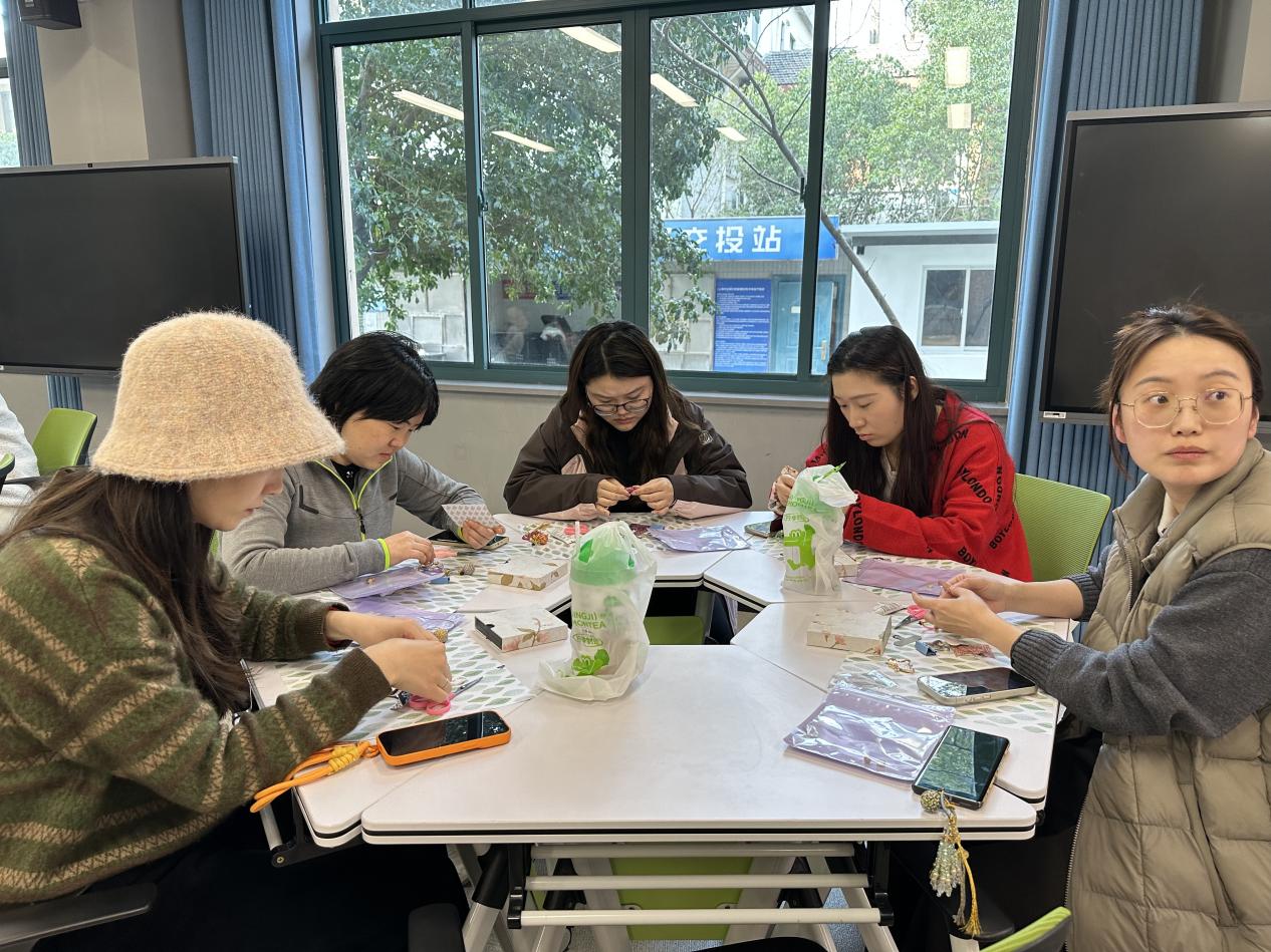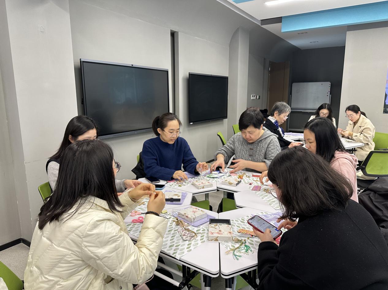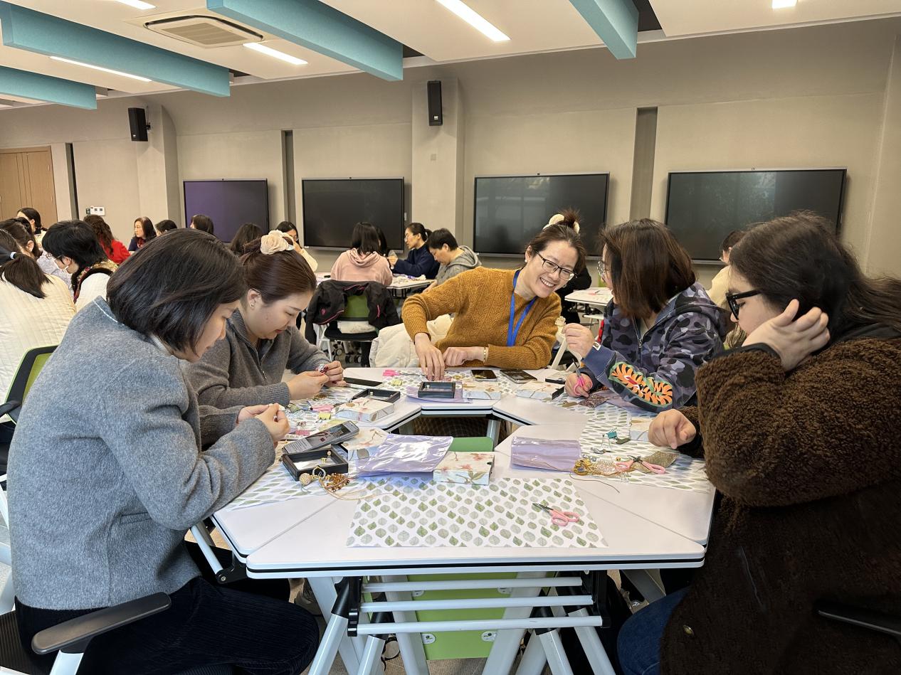活动进入动手实践环节后,现场氛围热烈活跃。女教职工们精心挑选心仪花色的宋锦面料,手持工具全身心投入创意制作之中。裁剪时凝神专注,拼接时反复琢磨,串珠时巧思点缀。大家还相互交流制作技巧、探讨搭配方案、分享创意灵感。在彼此协作与互动中,一块块素雅精美的宋锦面料逐渐变身为独具风格、小巧玲珑的宋锦饰品。现场欢笑声、讨论声交织,勾勒出一幅温馨和谐的春日美好图景。