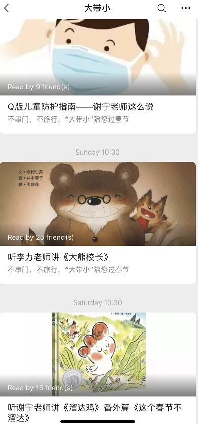 自除夕以来,由我院心理系吴念阳教授及教育学、心理学等相关专业的毕业生、在读生组成的“大带小”团队将儿童绘本制作成了一系列音频、视频,并通过“大带小”微信公众号推送给读者,为居家防疫的儿童提供更好的陪伴。让孩子们不出门也能听到好故事,学到好习惯,让这个特殊的假期有爱、有温暖、更有意义。《光明日报》、《上海科技报》、中国新闻网等主流媒体纷纷报道,点赞。