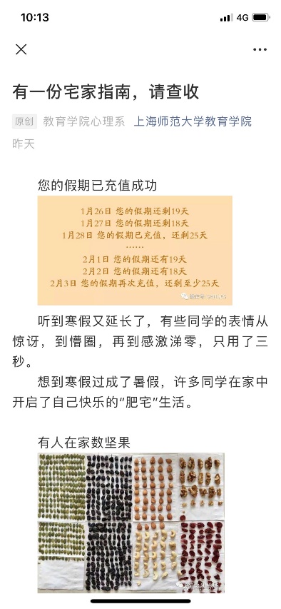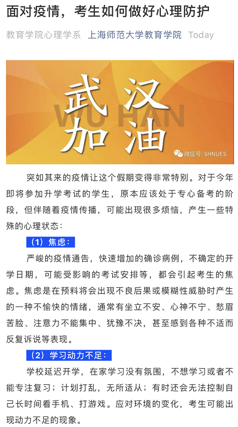 我院心理系教师运用专业知识解读疫情背景下的特殊心理状态,通过微信公众号等平台,发布心理调适相关科普文章。由赵欢欢、乌阿茹娜老师撰写的“面对疫情,考生如何做好心理防护”的科普文章已发布在教育学院微信公众号上,后续将有每周一期微信科普推送发布,以期为中小学生居家应对疫情时如何做好心理调适提供指导。由罗俊龙老师和殷悦同学撰写的《有一份宅家指南,请查收》则通过积极心理学的“心流理论”指导大学生在家如何设立目标并积极成长。针对大中小学教师在应急状态必须面对直播课堂的心理焦虑,副院长石文典教授又带领心理系团队推出了《为“速成主播”们的焦虑支招》《疫情下的心理保卫战》等系列减压疏导科普文章。