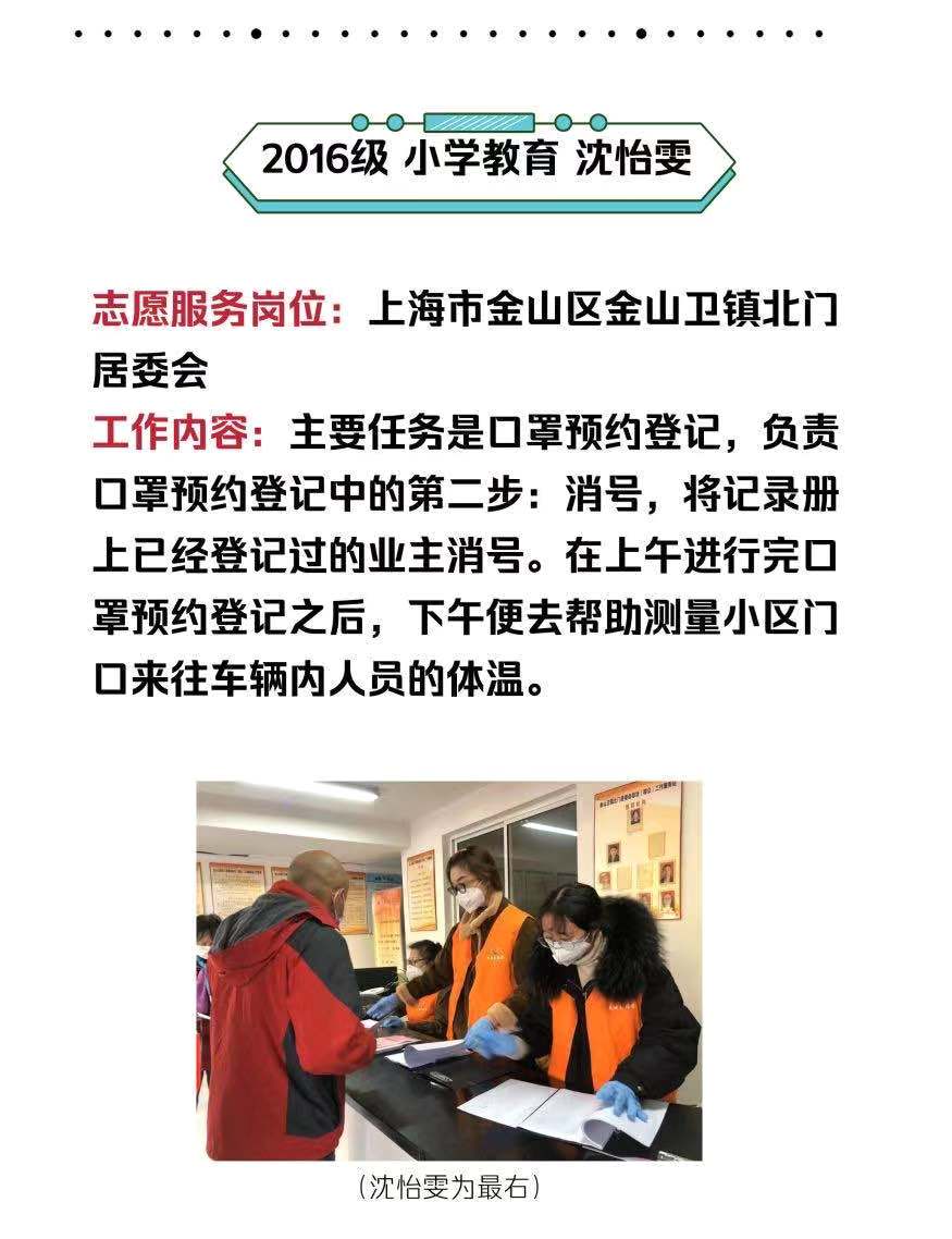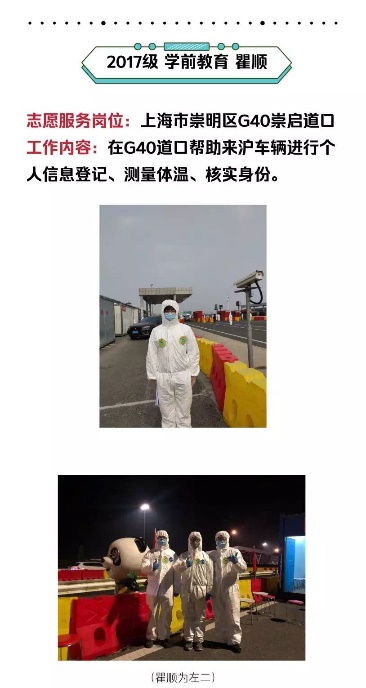 寒假期间,学院共有8名本科生志愿者积极响应号召,参与到上海各区抗击疫情志愿服务当中。其中6名同学积极投身线下工作,在G40崇启道口、金山区东风居委为来往旅客居民进行体温检测,协助上海红十字会、乡镇村委进行物资登记。2名同学在线上协助相关机构进行素材收集、事迹撰写,宣传网络正能量,践行教院学子的使命与担当。