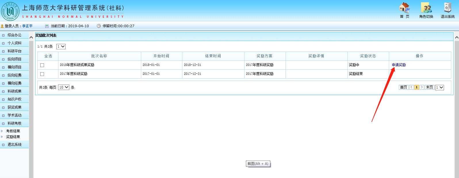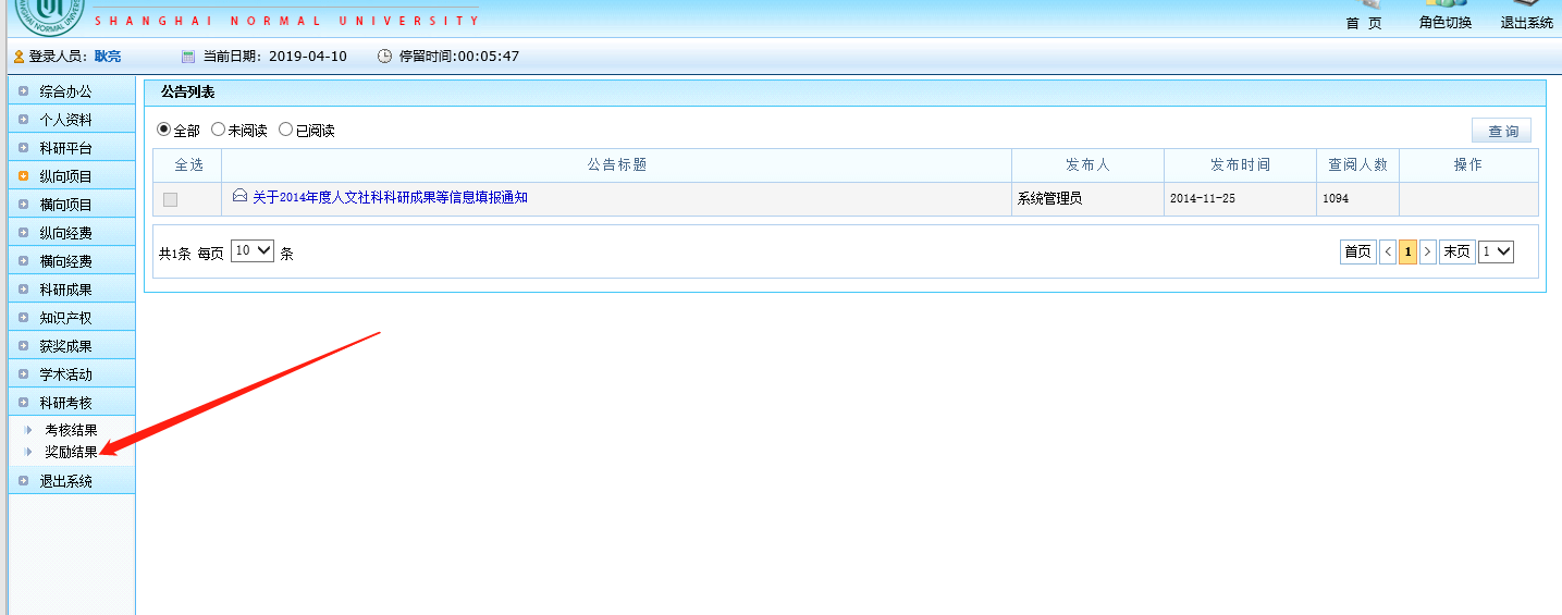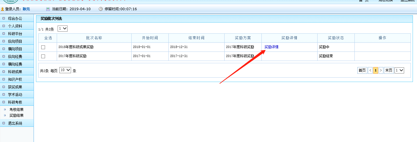 1、登录至科研管理系统,至左侧导航栏,在科研考核下,点击奖励结果,进入奖励界面。